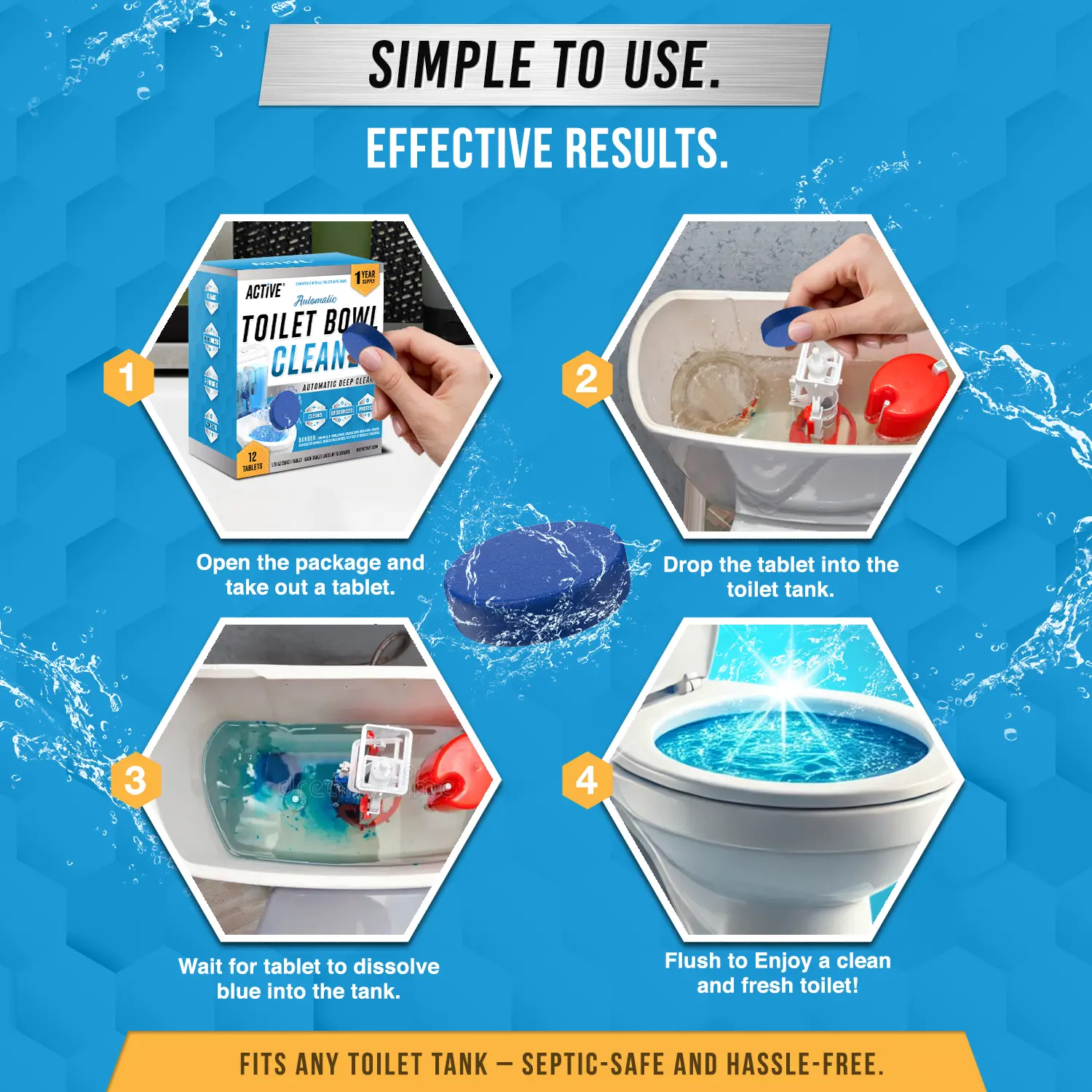 ·Powerful Automatic Cleaning: With Every Flush, Active Bright Blue Toilet Bowl Tablets are working hard to remove stains & odors from your toilet bowl. Each Auto Slow-Release tab works to Refresh & Clean the whole toilet system, use as toilet tank cleaner tablets, toilet cleaner tablets, toilet cleaners for inside the bowl, even internal water pipe and drain