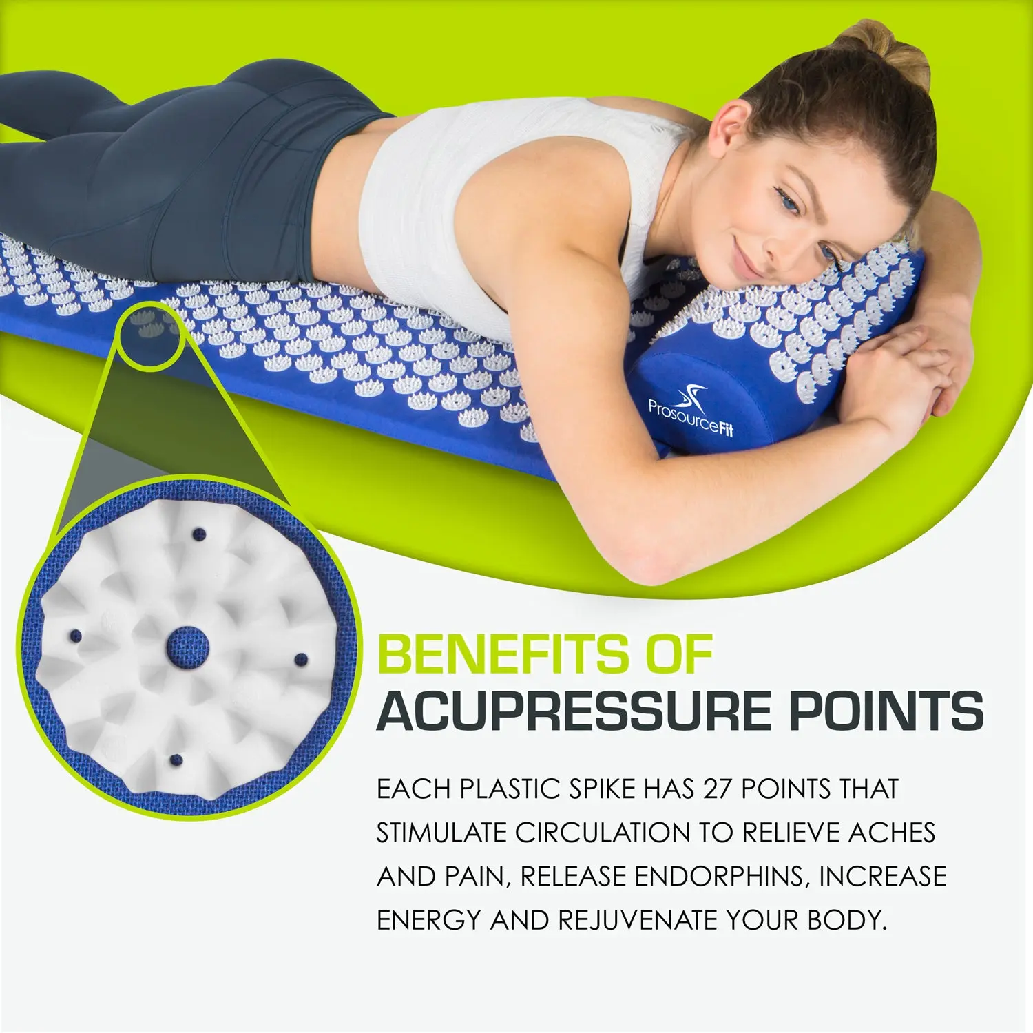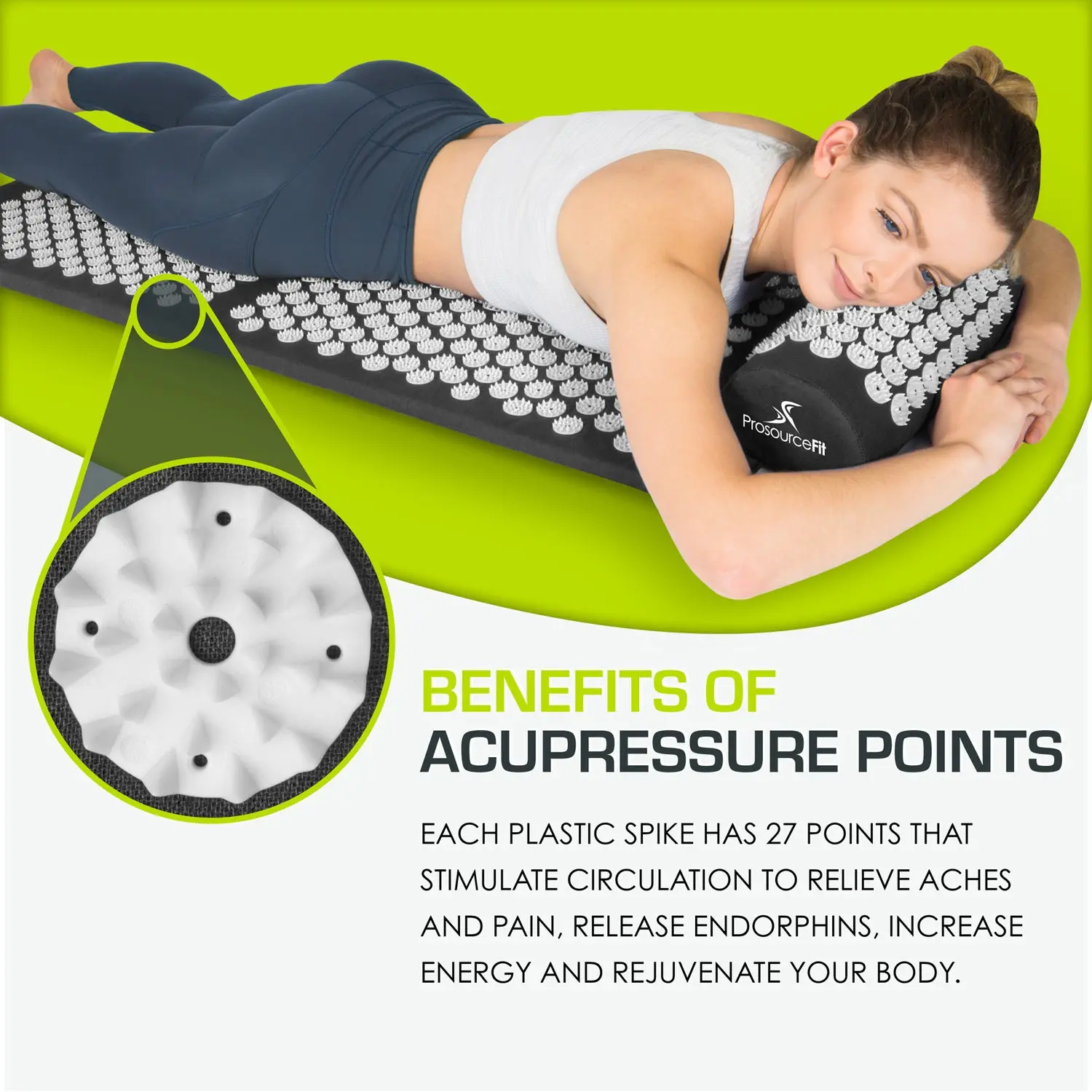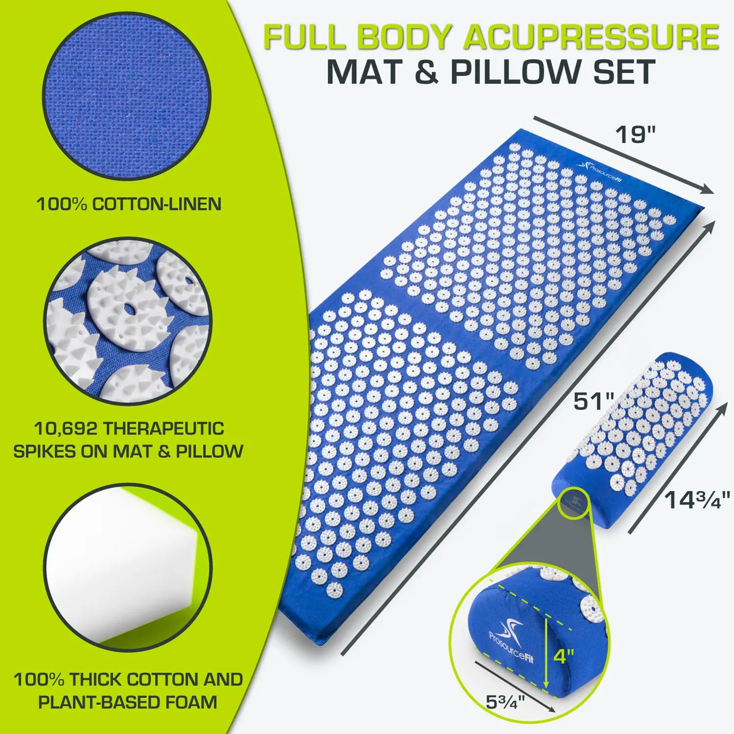 The ProsourceFit Acupressure Mat and Pillow Set brings the benefits of acupuncture into your home with a simple, effective solution for both physical and mental tension. The full-length cotton mat provides ample space to support your entire back, while the included neck pillow enhances the experience with targeted pressure for the upper spine and shoulders. Hundreds of plastic acupressure points gently stimulate circulation, relieve aches and pains, release endorphins, boost energy, and promote overall relaxation. While the sensation may feel intense at first, most users quickly adjust and find it deeply soothing. Just 20 minutes a day is all it takes to enjoy the natural, restorative benefits of acupressure—right from the comfort of home.