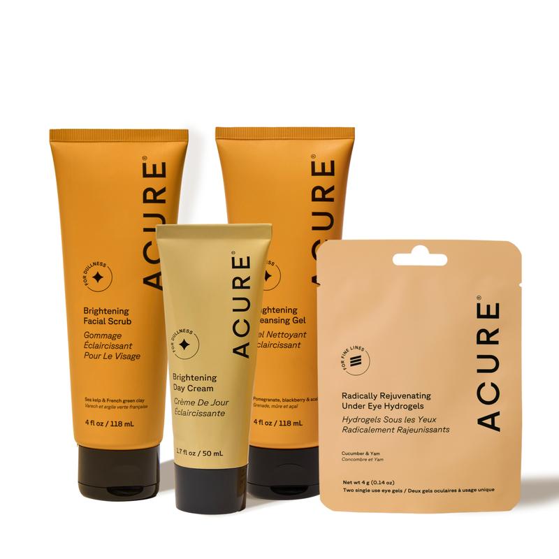 Acure Brightening Basics Skincare Bundle – Cleansing Gel, Day Cream & Facial Scrub with Under Eye Hydrogels