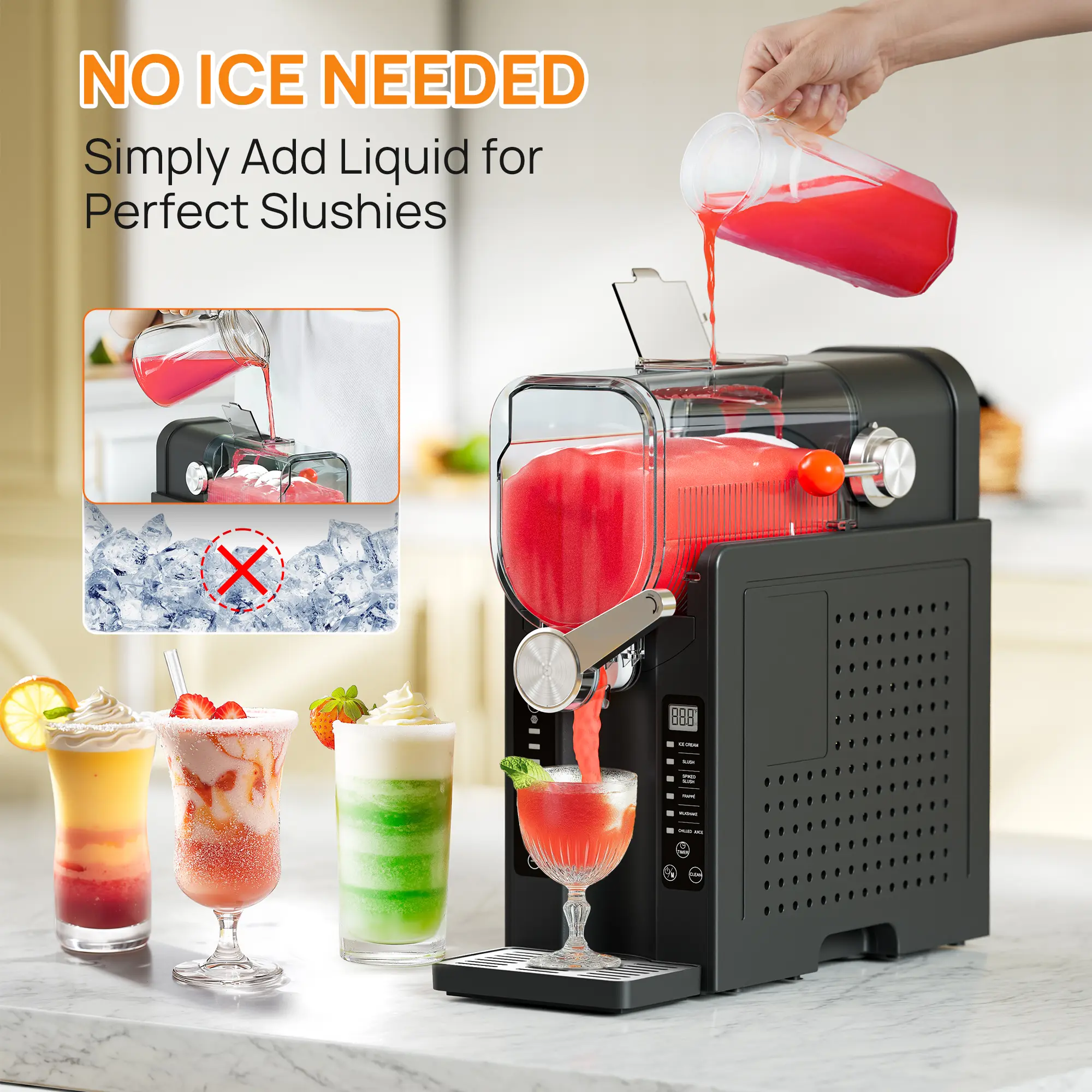 ·User-Friendly Design & Self-Cleaning: Equipped with an intuitive control panel, the slushie machine is designed for effortless operation. Additionally, it features a self-cleaning function to streamline maintenance. All removable components are dishwasher-safe, ensuring convenient and thorough cleaning. This ensures the machine is always prepared for your next frozen beverage experience.