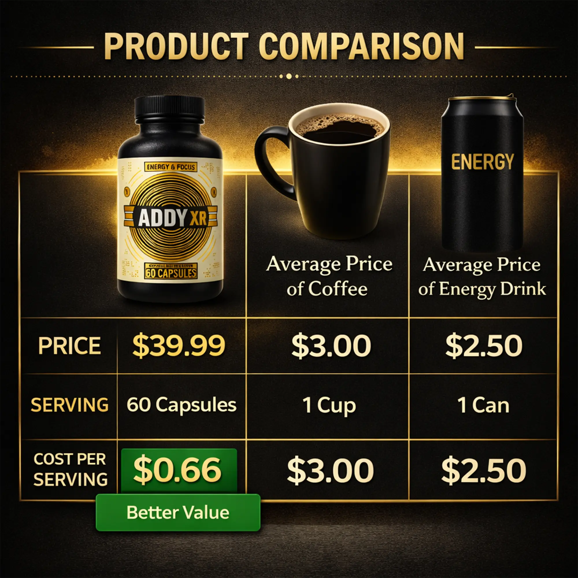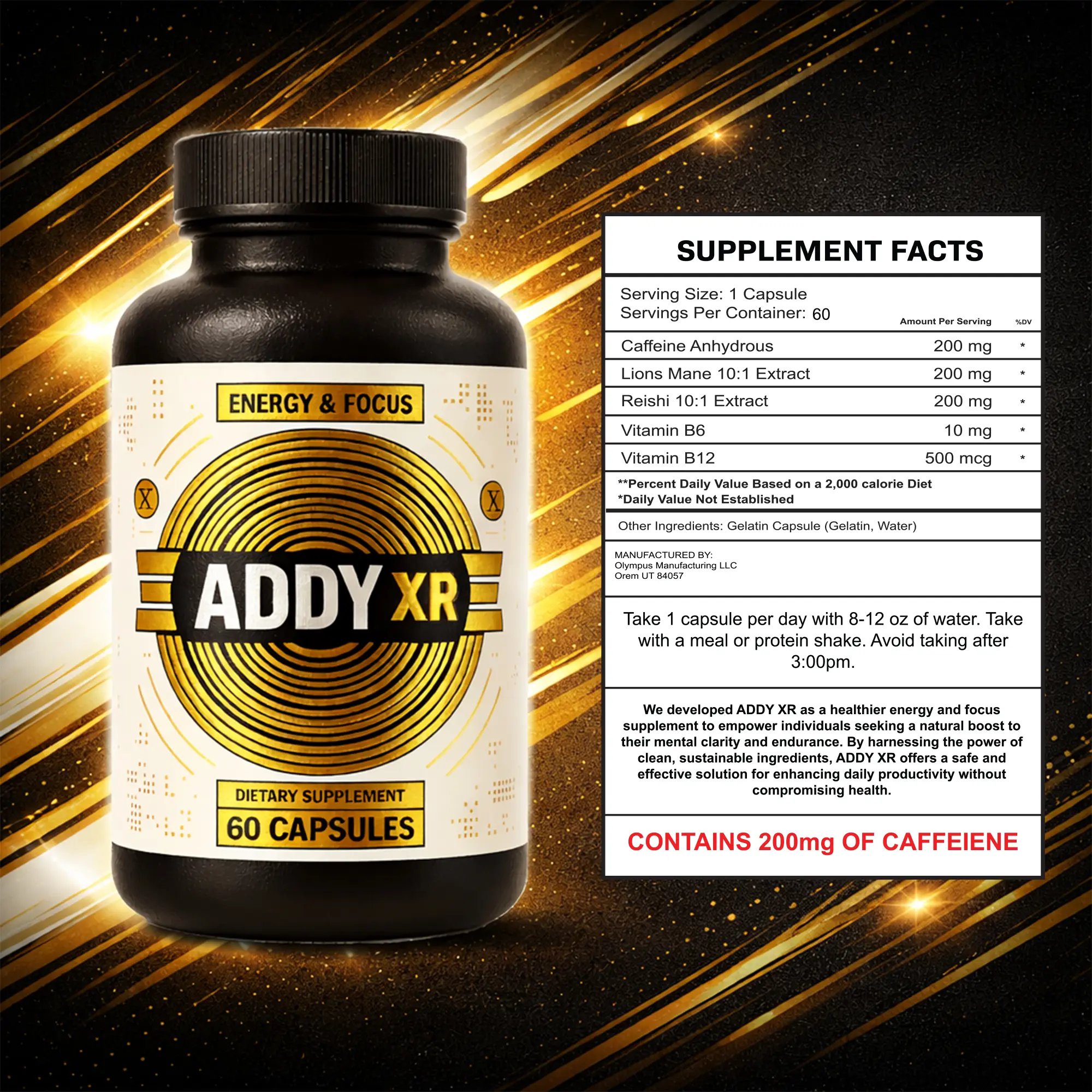 ADDY XR is a premium Adderall alternative designed for those who demand focus, clarity, and sustained energy without the crash. Formulated as a natural energy supplement, it delivers balanced cognitive performance, helping you stay sharp, motivated, and in control all day.