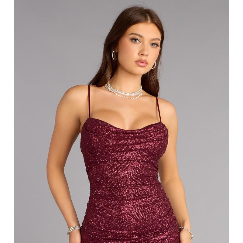 The Adelyn mermaid dress arrives with a gorgeous shimmer that catches the light from every angle, designed for entrances that draw the room in without trying. The glitter knit fabric skims the body with a draped cowl neckline and a sculpted mermaid silhouette, bringing that glamorous drama.