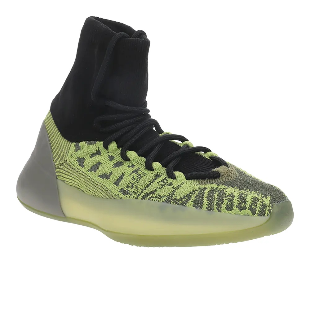 The Adidas Yeezy Basketball Knit ‘Energy Glow’ represents the debut colorway of a new hoops shoe. Varying shades of green are executed on the Primeknit upper, secured with rope laces and a stretchy high-cut collar that delivers a sock-like fit. Rearfoot support is provided by a prominent heel counter borrowed from the Adidas Yeezy Quantum. The breathable knit build is mounted on a full-length Boost midsole, wrapped in a semi-translucent cage and reinforced by a herringbone-traction rubber outsole.