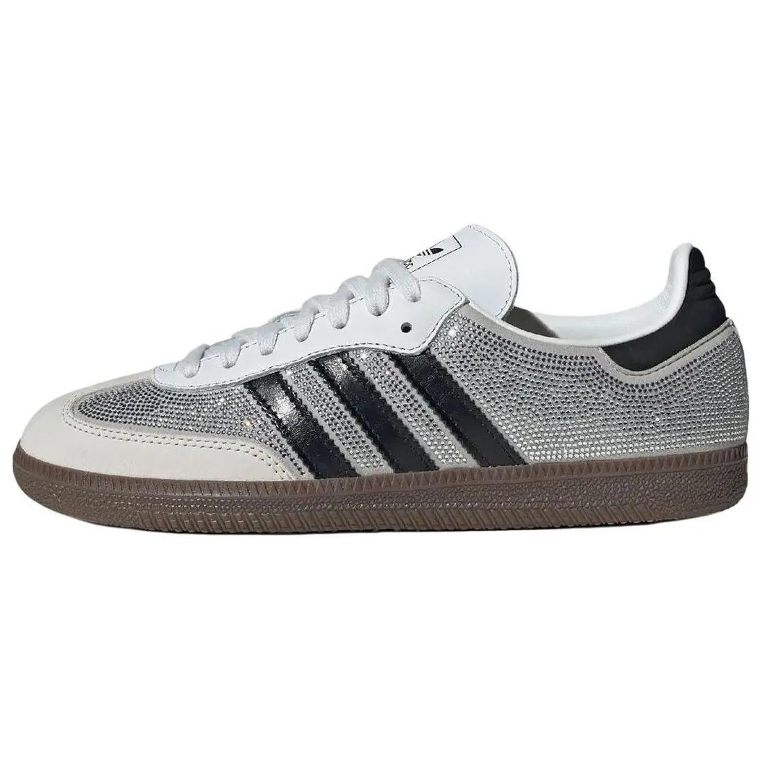 Adidas Wmns Samba OG 'Crystal White Rhinestones' – classic retro design with sparkling rhinestones. Available in US sizes 5-12. True to size for most, but narrow fit; consider sizing up for wider feet. Lightweight, durable, and stylish for casual wear. Perfect for sneakerheads seeking a vintage look with a modern twist.
