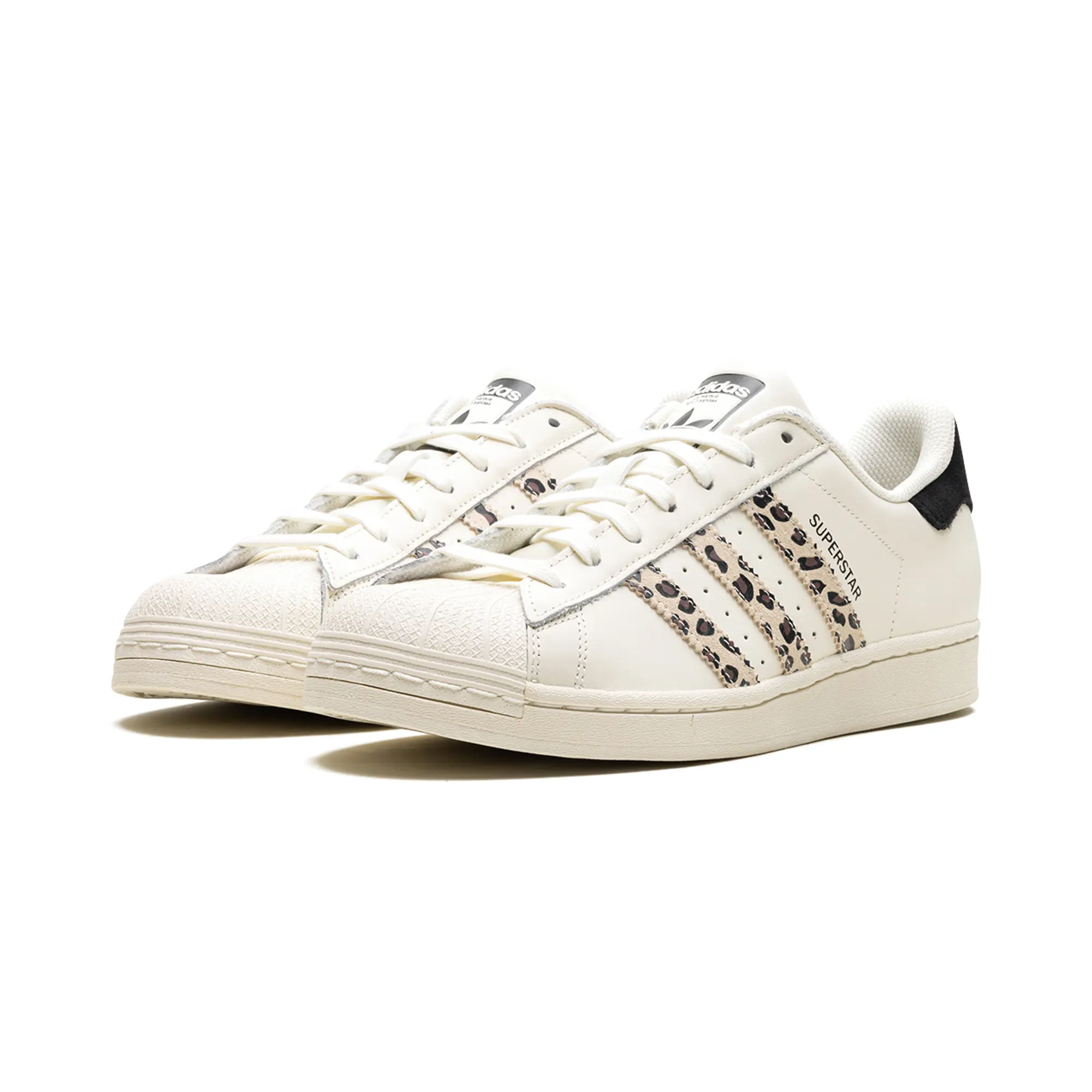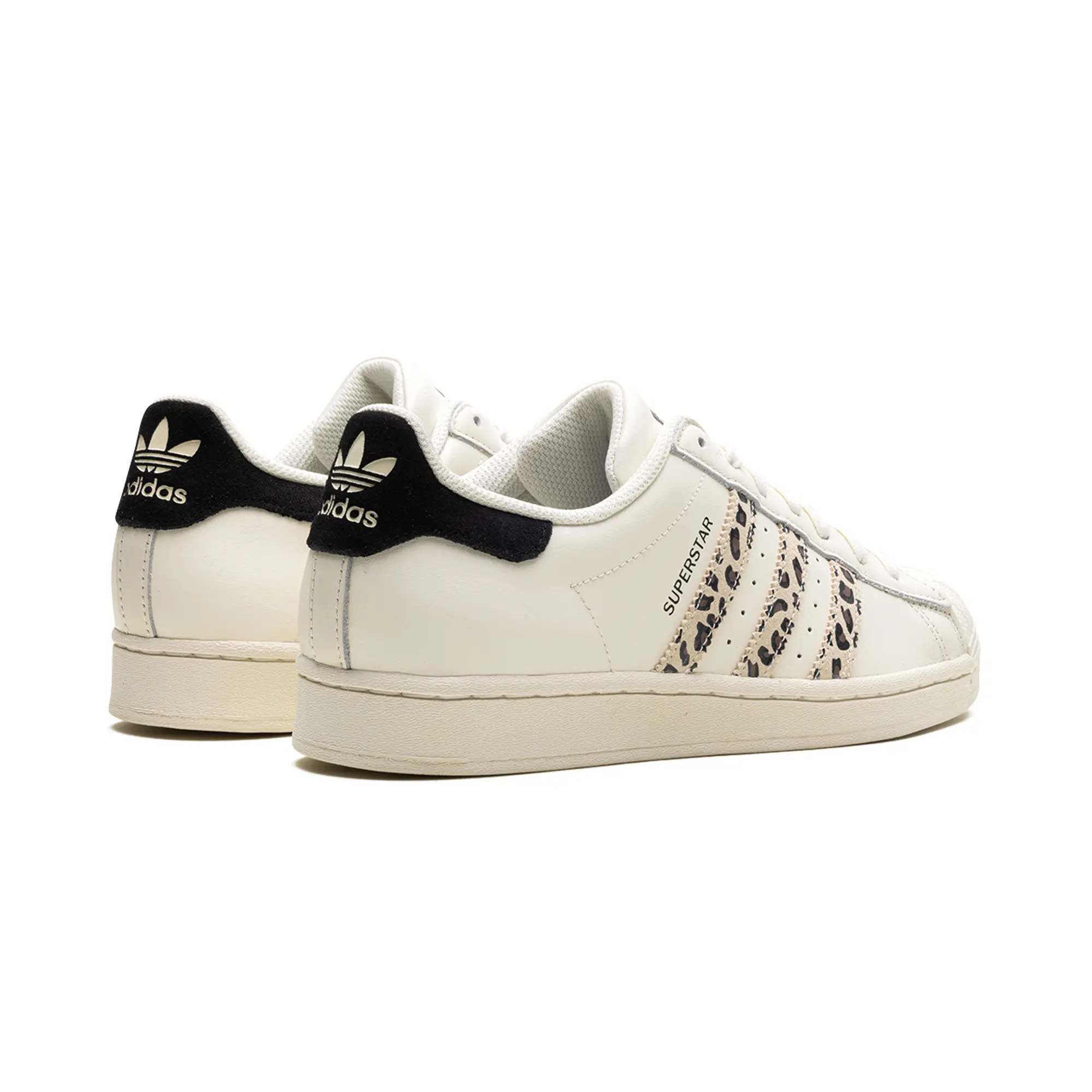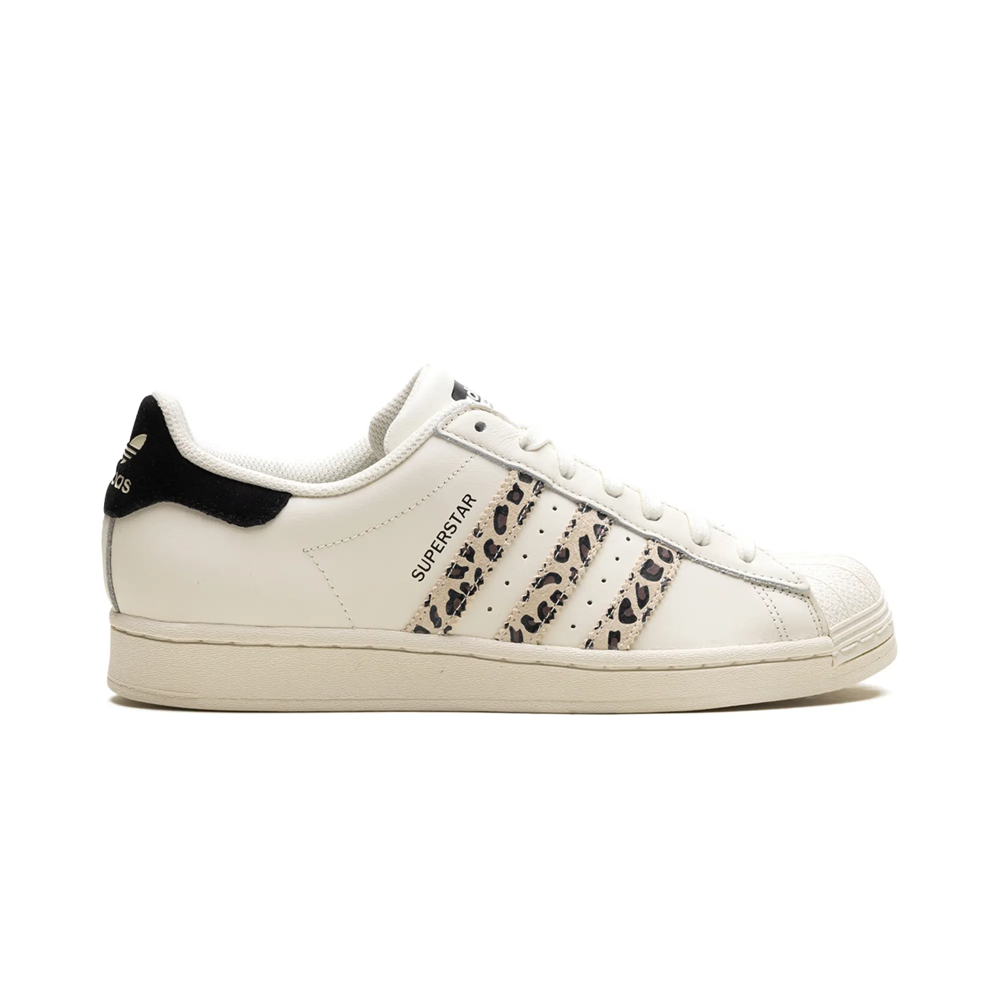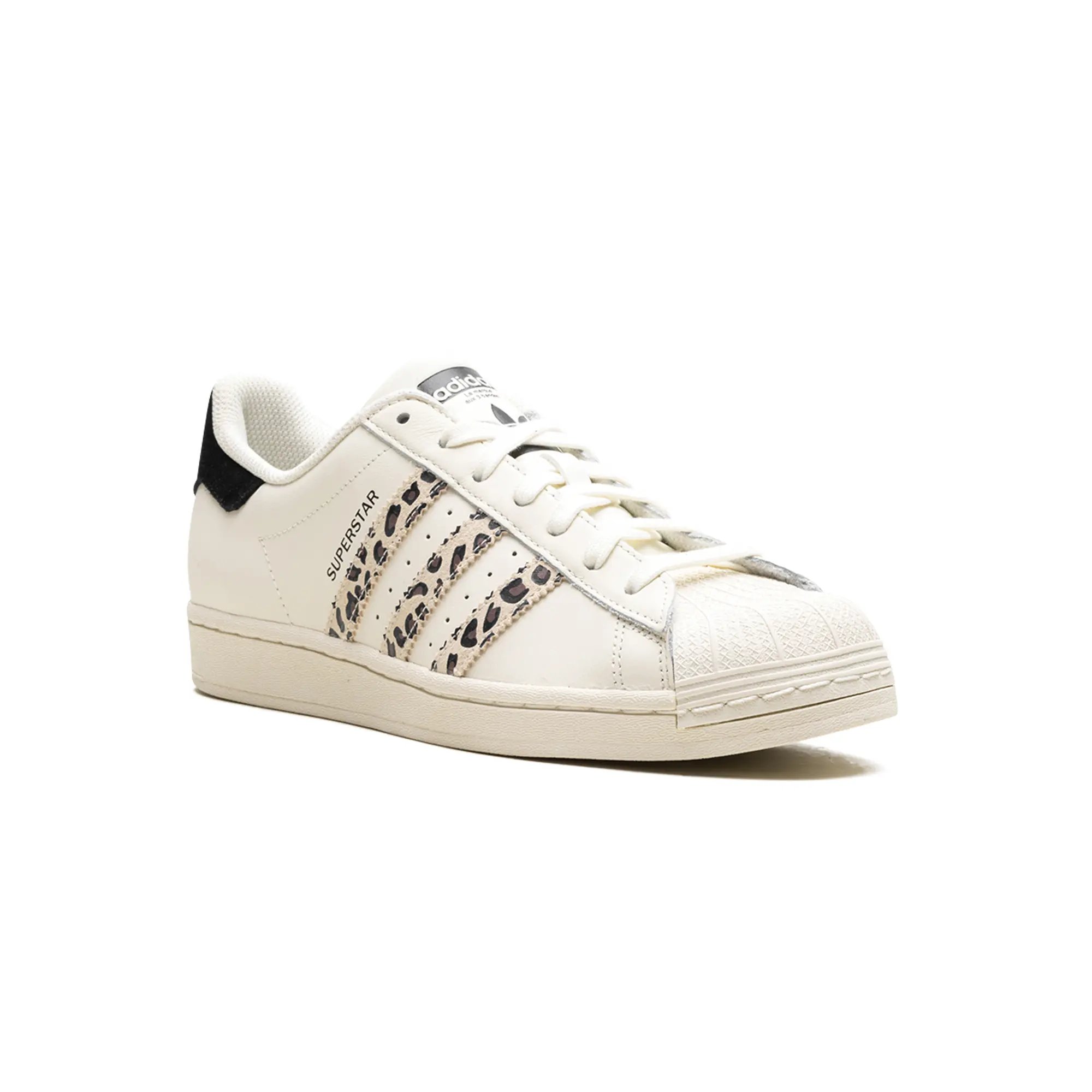 The Superstar WMNS 'Off White Black Leopard' shoe features a classic design with a bold leopard print, offering a versatile and stylish addition to any sneaker collection.