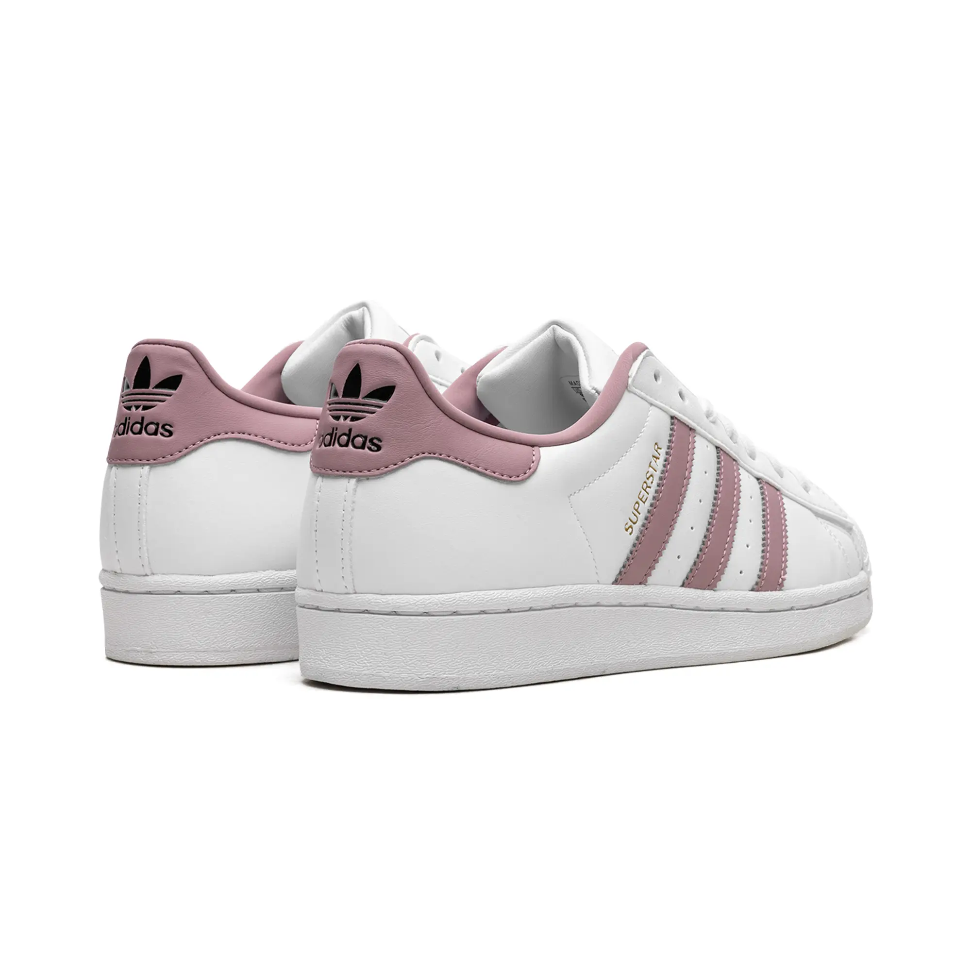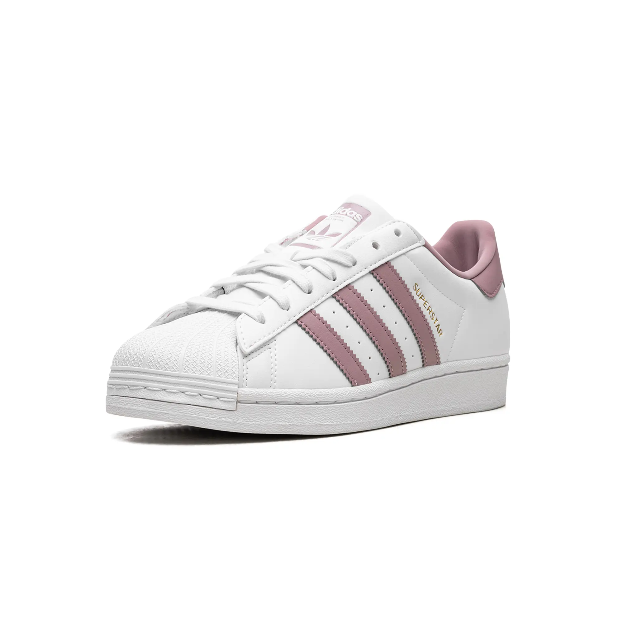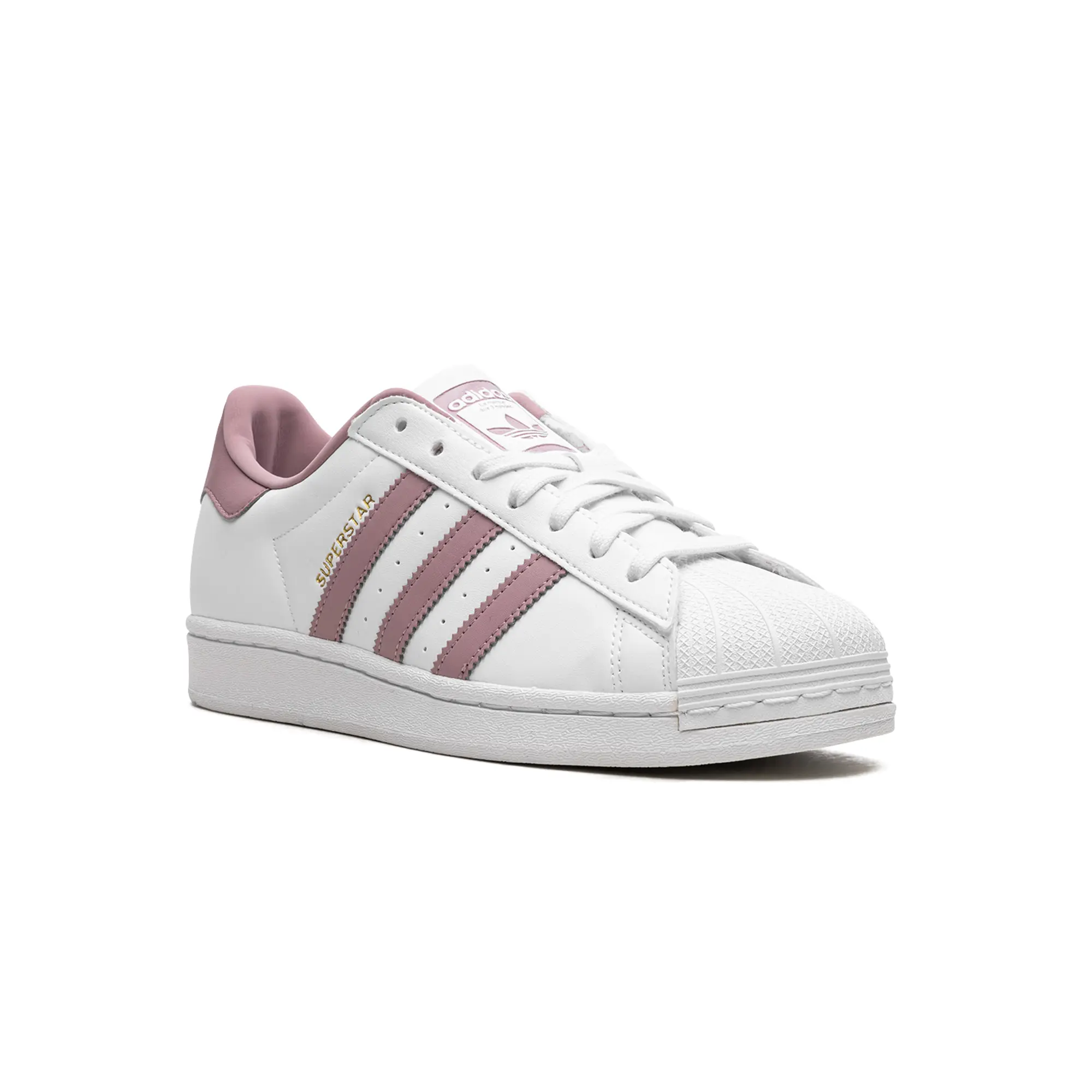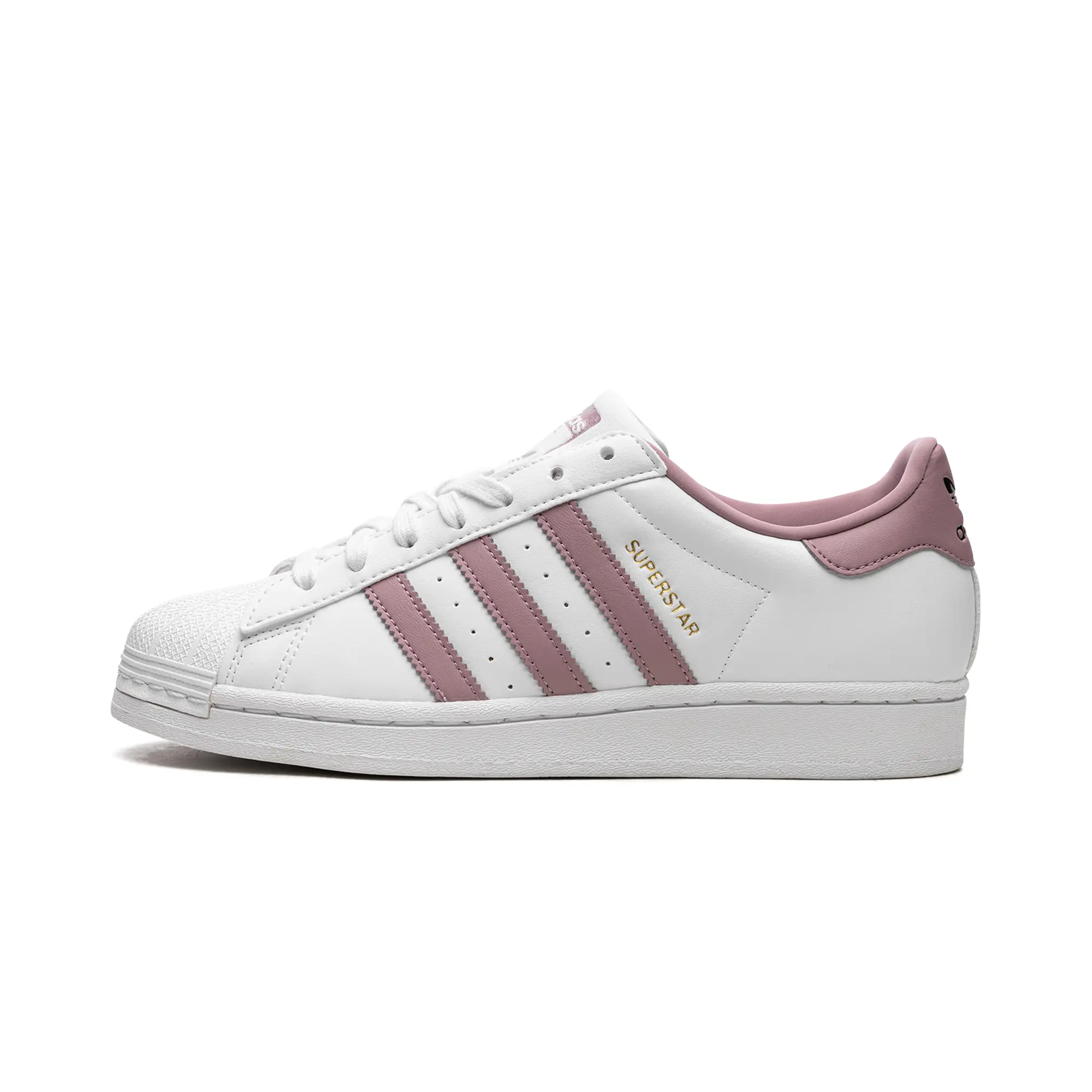 The Superstar WMNS 'White / Magic Mauve' shoe features a classic design with a touch of modern color, offering a versatile and stylish addition to any sneaker collection.