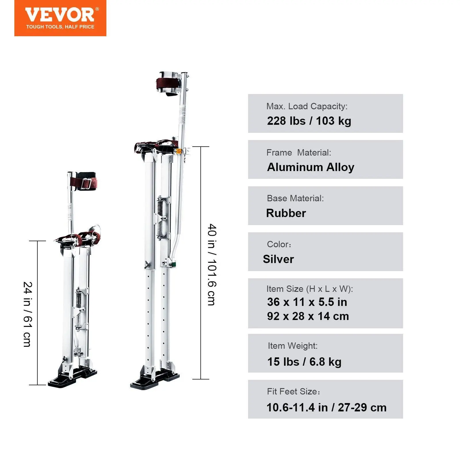 • Sturdy Aluminum Alloy: Get ready for more support! VEVOR's drywall stilts can easily hold up to 228 lbs. Made of robust aluminum alloy, featuring rust-proof, non-deformed, and optimal stability performance. Get ready to set the standard! In addition, you no longer have to worry about breakage due to its long service life.