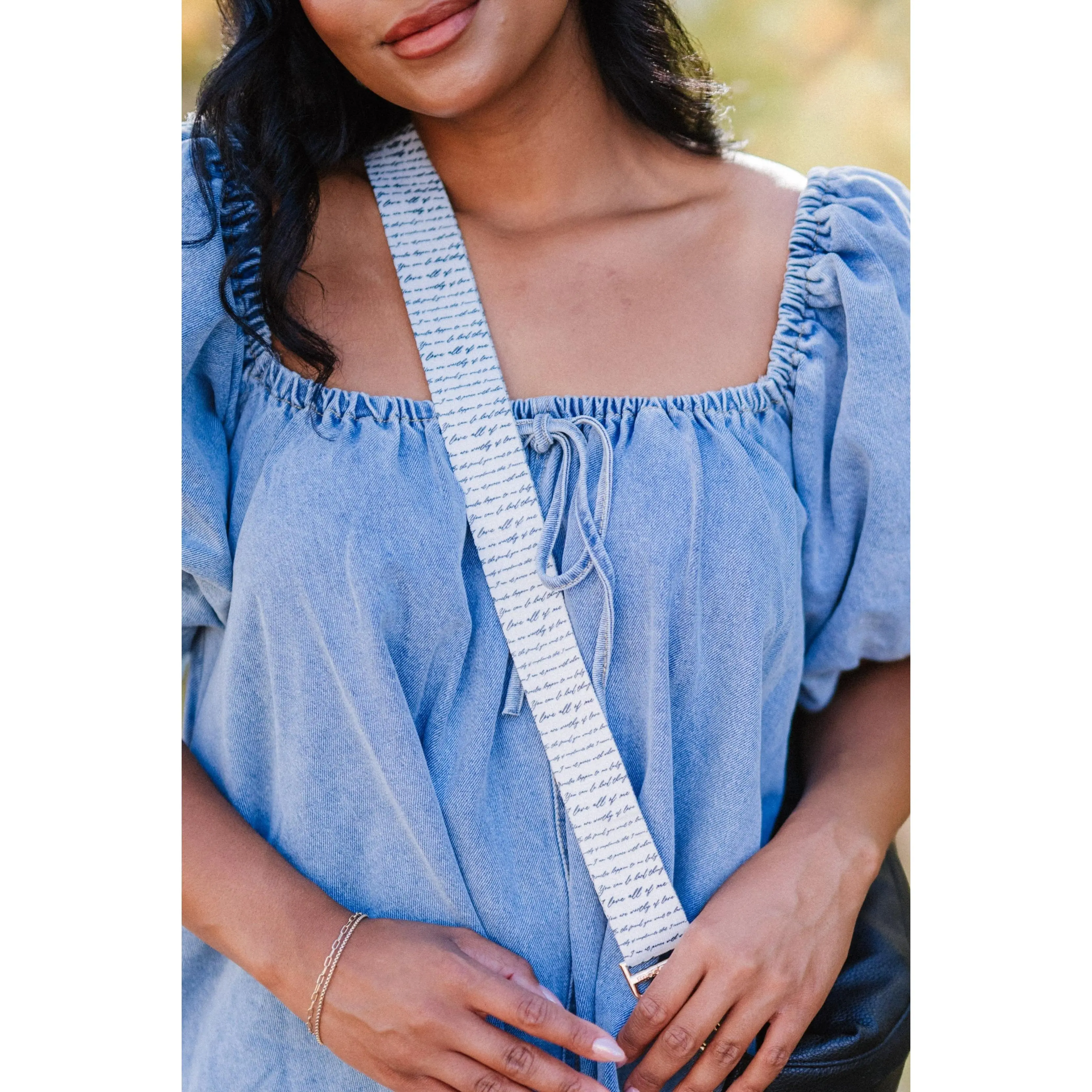 This strap is adorable! It’s very easy to adjust even when it’s hanging off your shoulder. The sayings are even cute