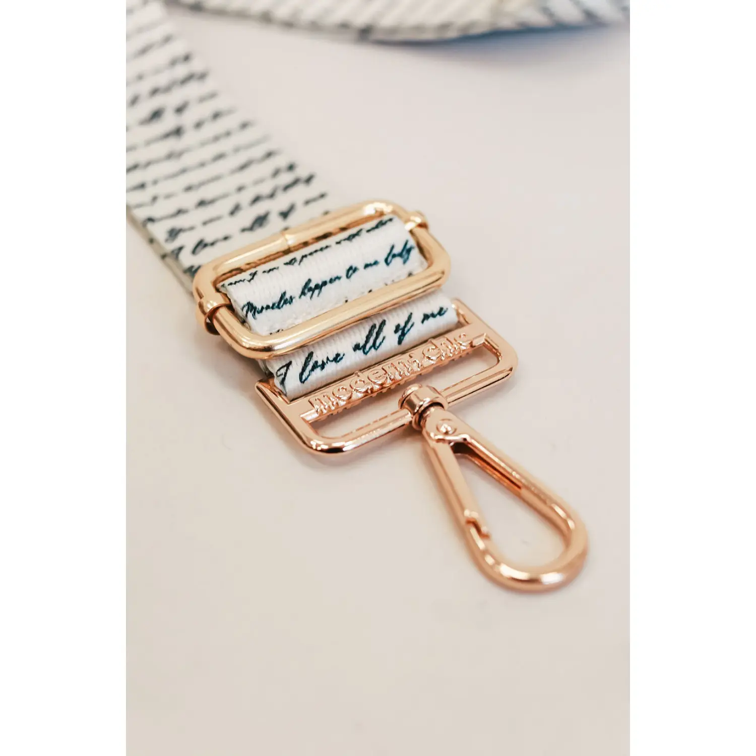 The strap with the writing is beautiful but the quality of the clips and hinges is far below what I expected. I thought it would be made of metal but they feel and look like very cheap plastic. If they improved the quality of materials I would give it 5 stars! I love their book ads but after buying this strap I’m wary about the purses.