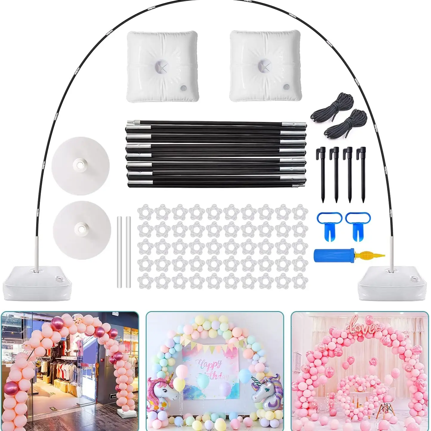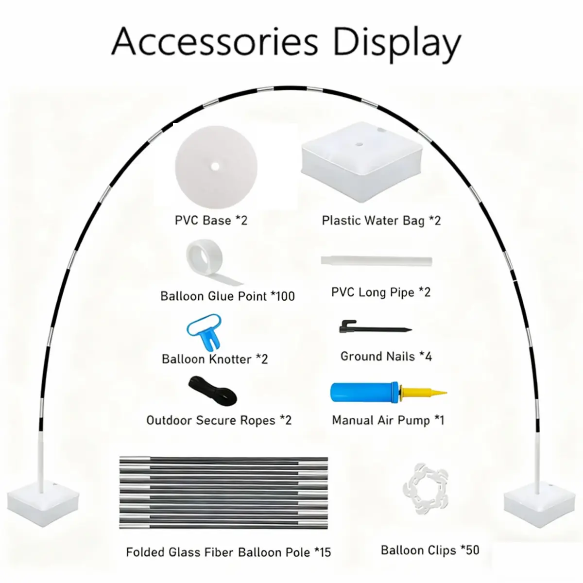【COMPLETE PARTY PACKAGE】: balloon arch kit package includes 15 folded glass fiber pole, 2 PVC Base, 2 PVC pipe, 2 water(sand) fillable bag, 1 manual pump, 50 balloon clips, 2 balloon knotter, 2 ground secure ropes, 4 ground nails. It will enough for all party decoration you need.