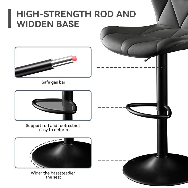 ·【Safety Guarantee & Easy to Clean】Sturdy and comfortable for extended sitting, our bar stool boasts SGS certified gas lift, solid pedestal base, and metal pole and base that can support up to 300 lbs, ensuring stability. FSC-certified wood frame and high-density sponge padding provide durability and comfort, while the easy-to-clean faux leather makes it perfect for commercial and home use. It also features a rubber ring on the base that prevents floor scratching.