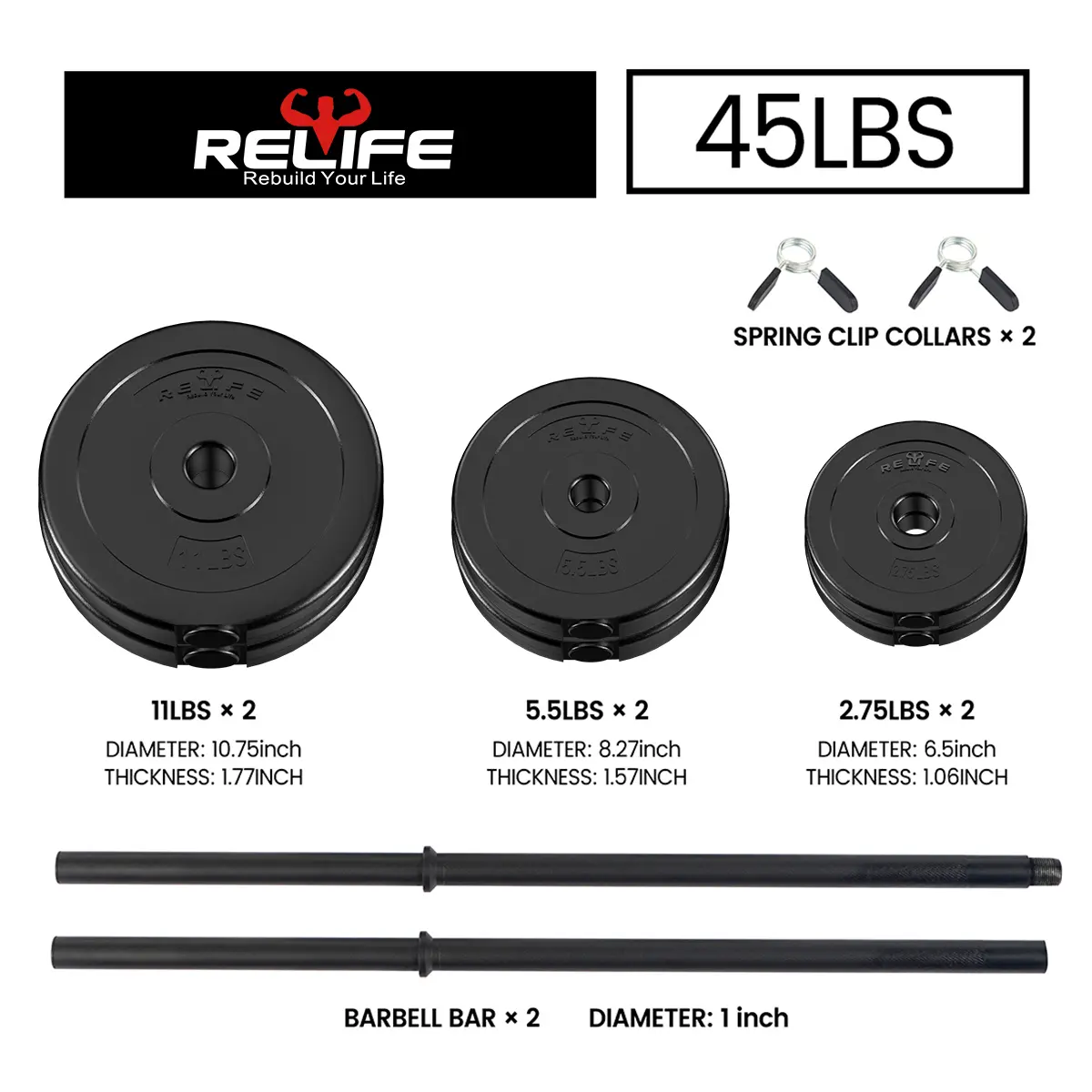 ·[Simple and Easy to Install] Two 11 pound weight plates, two 5.5 pound weight plates, two 2.75 pound weight plates and a 4.8ft barbell handles and two Spring Clip Collars. Great for targeting individual muscle groups or incorporating into a full body workout.