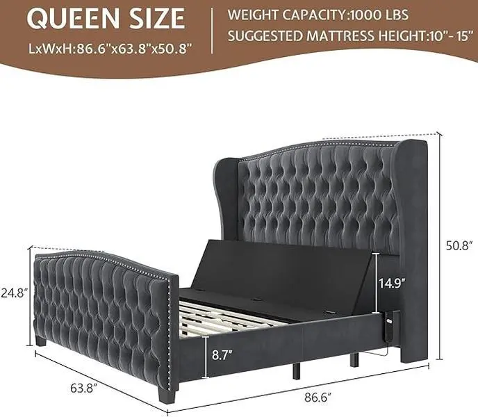γModern & LuxuryγUpholstered bed features a unique winged headboard, exquisite handmade button tufting and silver nailhead accents, showcasing luxury and refinement. High-quality velvet fabric provides unrivaled comfort