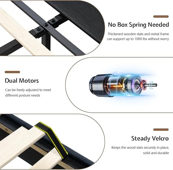 γSturdy & SolidγLow-noise dual motors have passed fatigue tests to ensure superior quality and durability. Sturdy metal support legs and thickened wooden slats ensure the stability of the platform bed