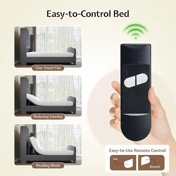 γAdjustable Bed FrameγHead of the electric bed frame can be raised from 0Β° to 65Β°, ergonomically designed to help you easily find the most comfortable position for reading, gaming or watching movies, relieving daily stress and fatigue