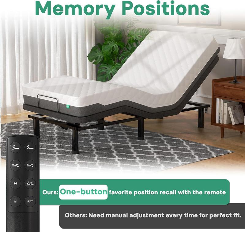 ·SAVE YOUR FAVORITE POSITIONS WITH ONE BUTTON - Use the wireless remote memory preset to adjust your comfort of the bed frame and save your preferred settings the wireless remote with just ONE button.