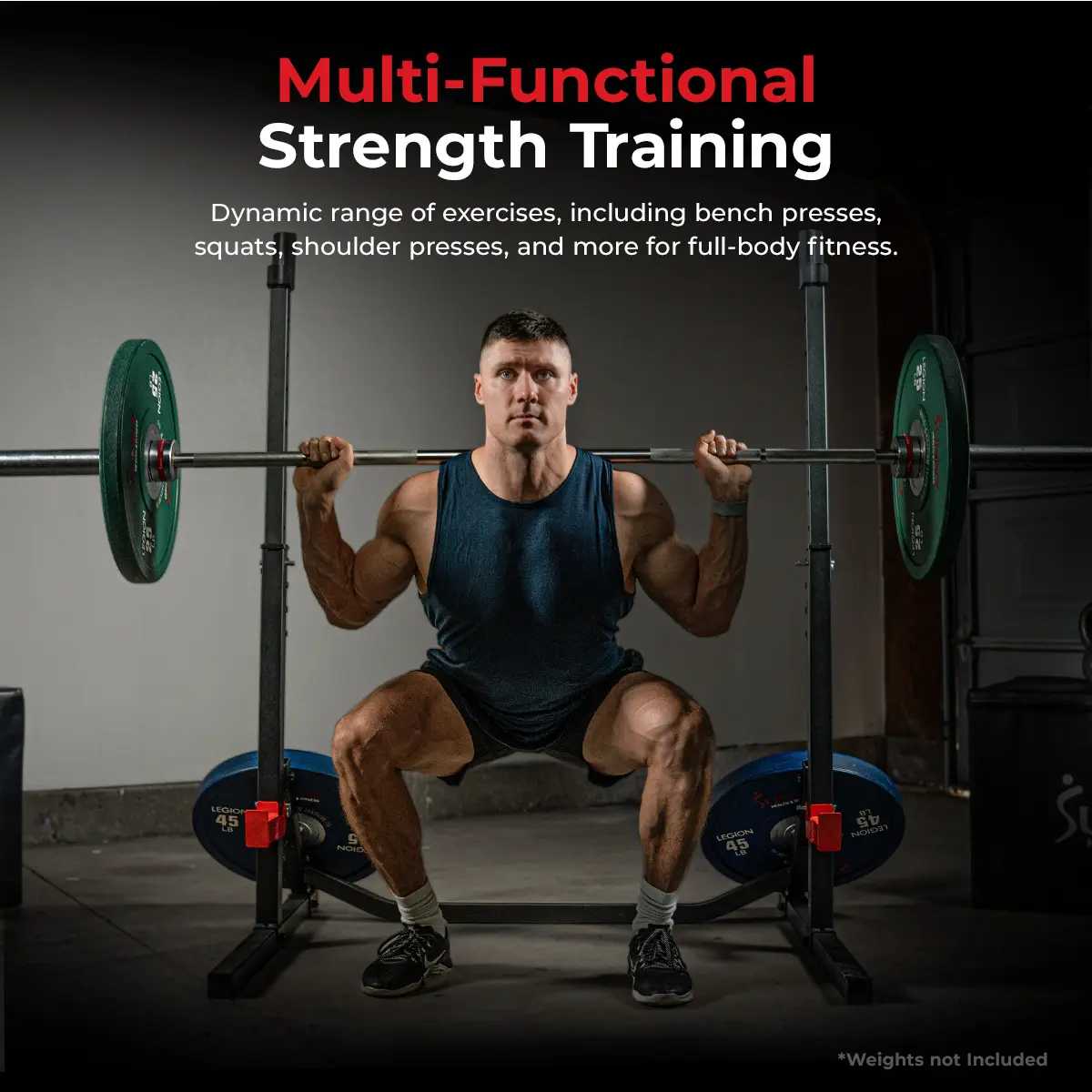 Introducing the Sunny Health & Fitness Multifunctional Adjustable Bench Press Squat Rack (SF-XF922011) – the space-saving solution for versatile strength training. Achieve full-body fitness with bench presses, squats, shoulder presses, incline bench presses, dumbbell rows, bicep curls, and deadlifts, targeting multiple muscle groups.