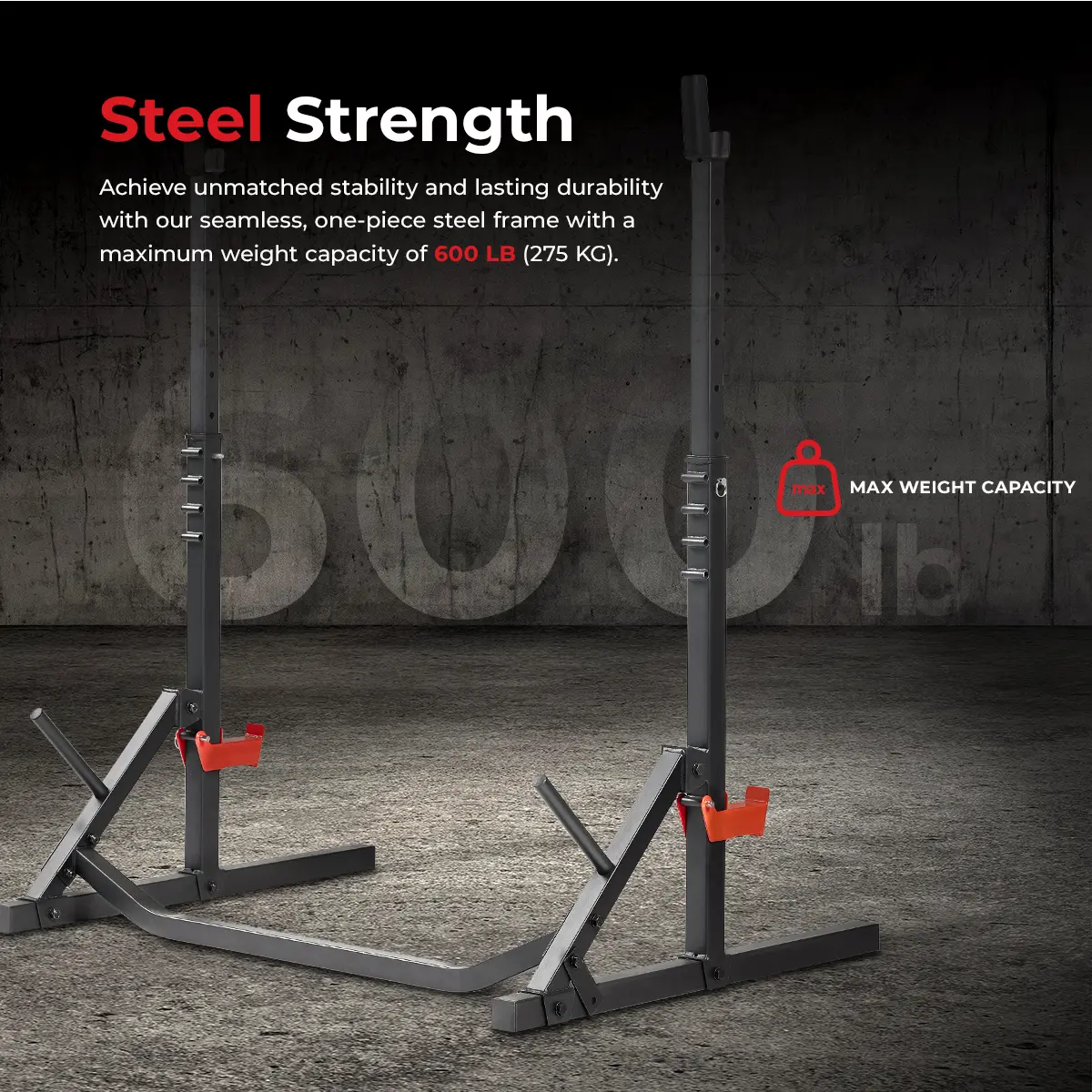 Crafted with a robust one-piece steel frame, this equipment offers unparalleled stability and durability, ensuring safety during intense workouts. Easily customize your workout experience with versatile height adjustments for precision and comfort. Safety is paramount, with spotter arms providing top-to-bottom protection, and an integrated weight holder rack ensures easy access to your weights.