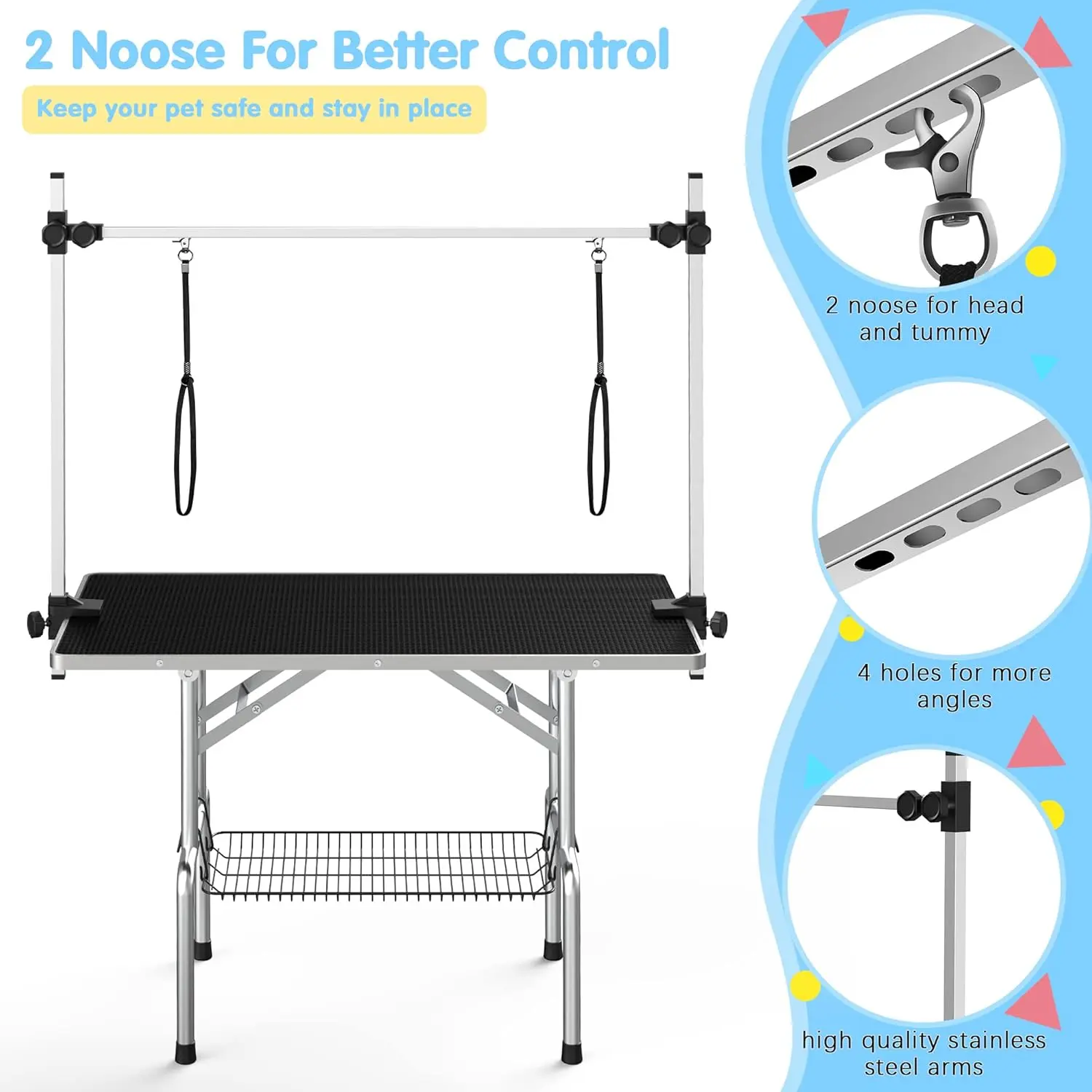 ·【Fit All Size Dogs】 2 Noose for better control your furry friends when grooming. Adjustable arm can be adjusted to fit pets of different sizes
