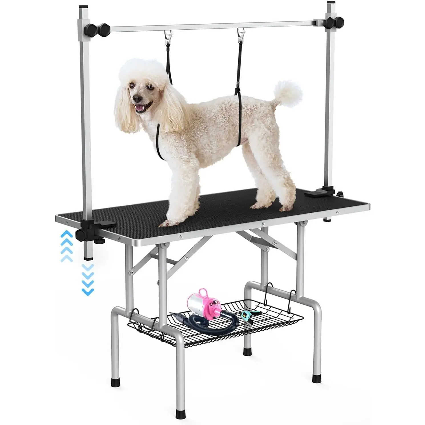 ·36 INCH DOG GROOMING TABLE Help Pet Groomers to Save More!Whether you are a professional groomer or an occasional one, grooming your dog right at your home, a dog grooming table is a must-have equipment. DIY your own grooming salon and save money in pockets just starting from the basic activities like hair cutting or nail trimming to serious grooming tasks. Your task becomes much easier, convenient and obviously, faster. Additionally, your dog remains steady and safe so you don't have to worry.✔Back Saver& H-type Adjustable Grooming Table Arm - Designed with movable and 38’’ tall adjustable firm grooming arm and 2 noose to better fit for various pets of different sizes. One could simply use the clamp and security Loop to keep them in position for an extended grooming session. The perfect height of this table, makes it a better back saver.✔36'' Large Grooming Table - 46" x 24" x 64", suitable for all kinds of small, medium and large pets, like cats, rabbits, miniature, poodle, schnauzer, pomeranian, samoyed, papillon and all kinds of other puppies, even for larger breeds.✔Storage Basket for Pet Grooming Supplies - Easy to remove and install storage basket size 25.6"*12.6", with a load capacity of 22BLS, perfect for grooming supplies and accessories that need to be used.