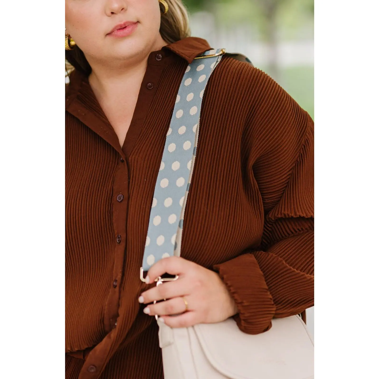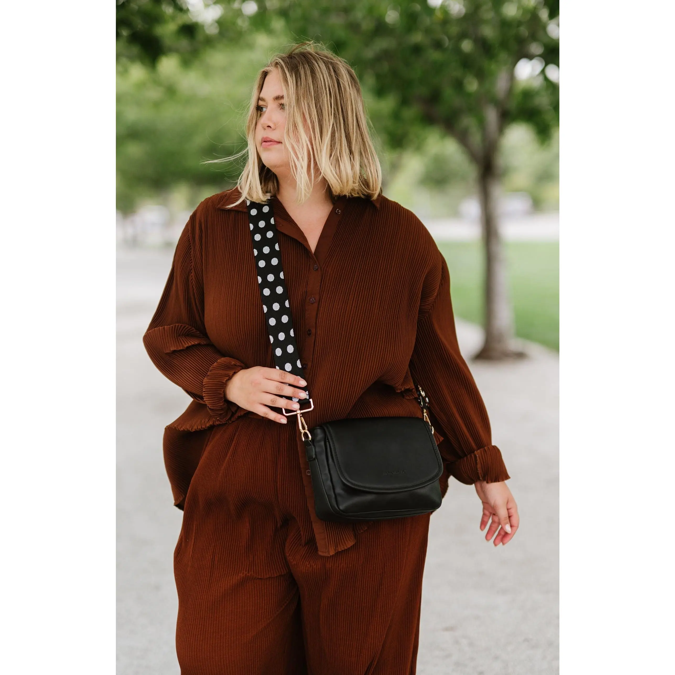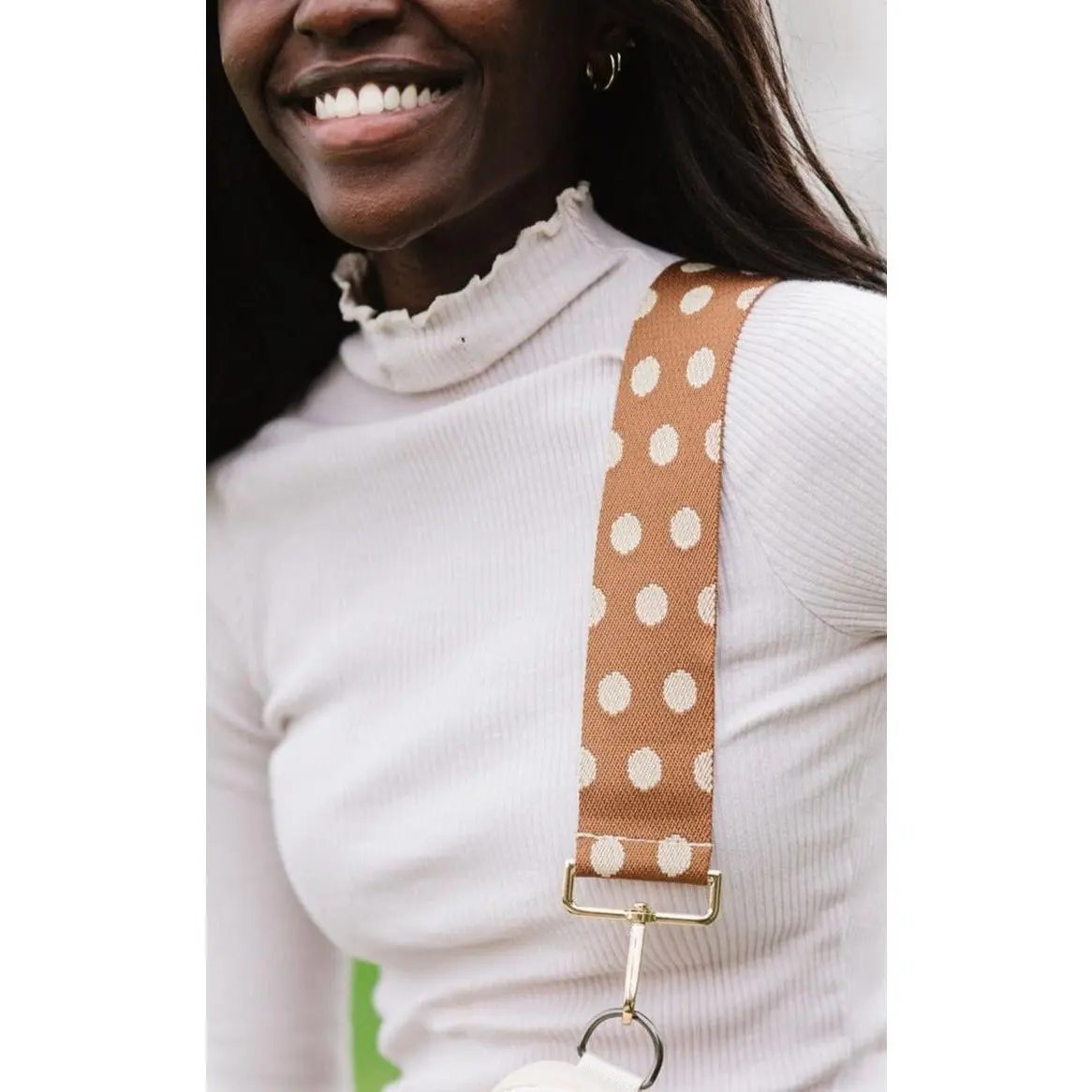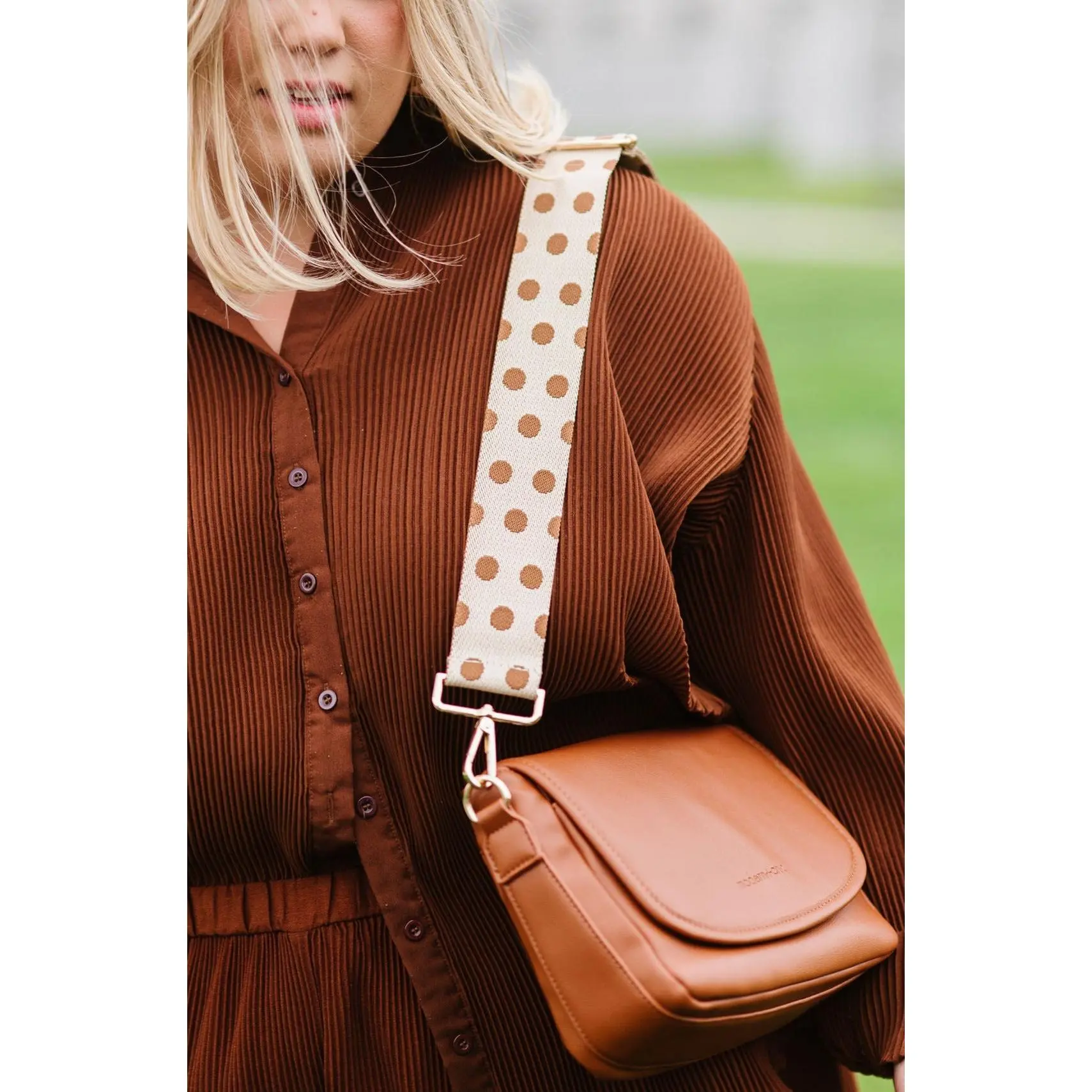 ·Caramel with warm vanilla dots is paired with the Lainey Convertible Crossbody in ivory