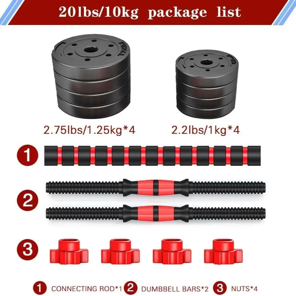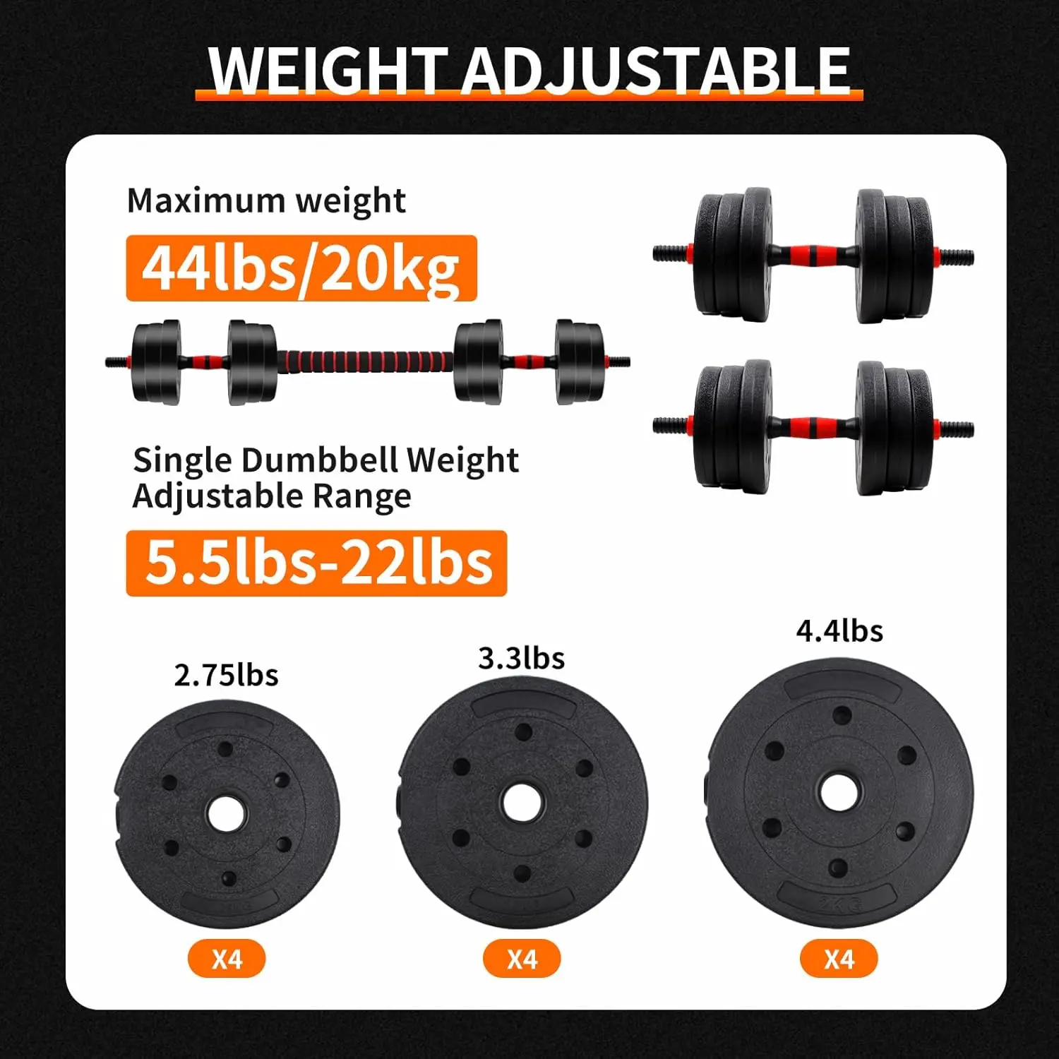·44 lbs fitness dumbbells include: 4 × 4.4lbs, 4 × 3.3lbs, 4 × 2.75lbs weight plates, 4 dumbbell nuts, 1 connector, and 2 dumbbell bars. 📦
