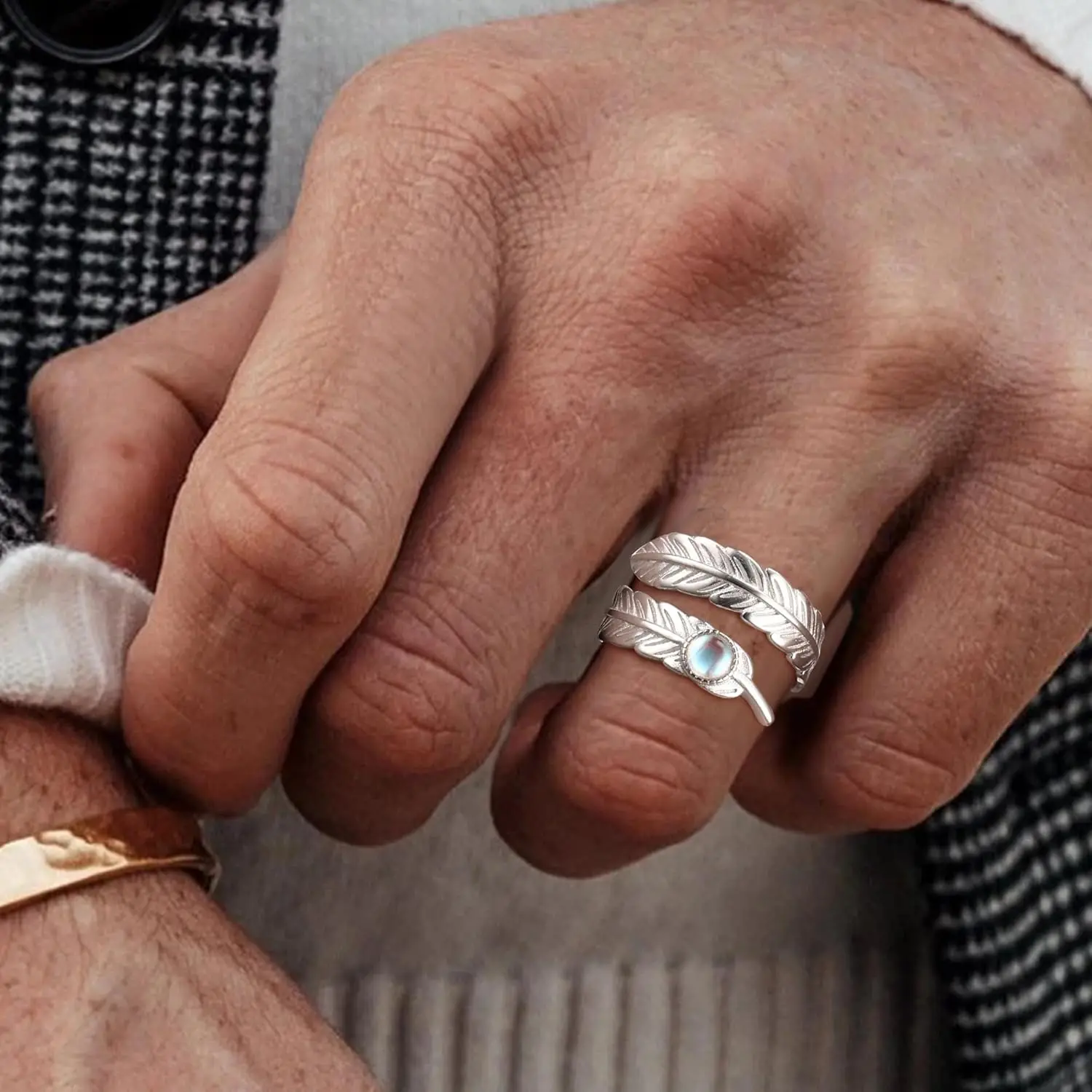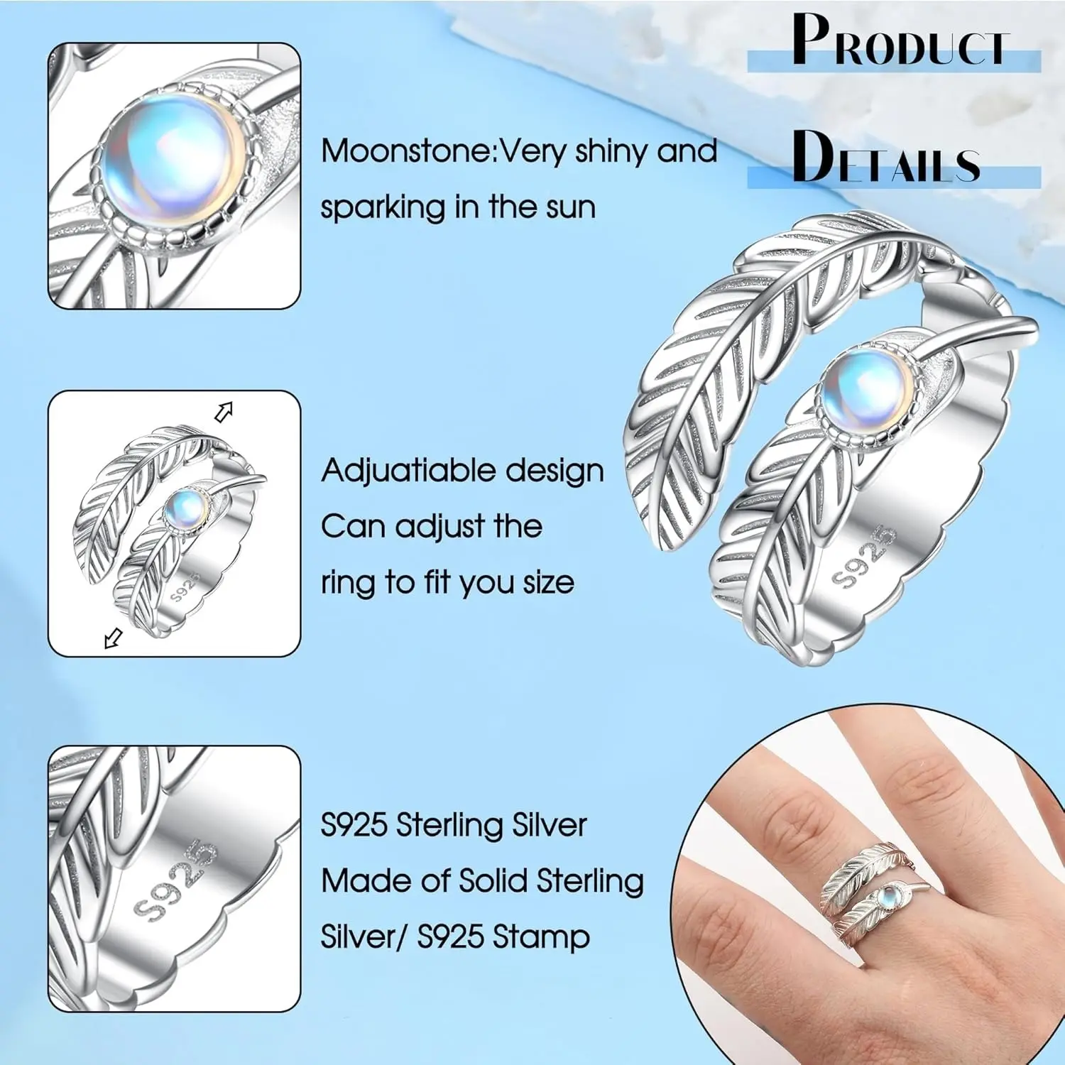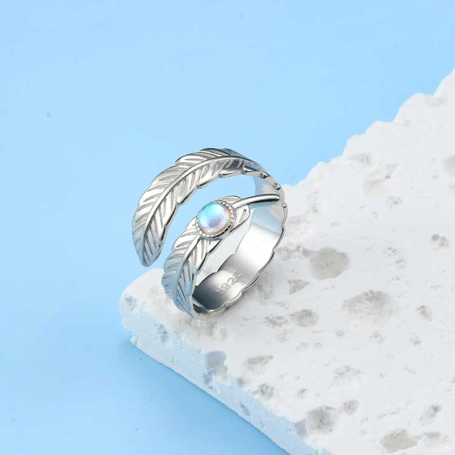 Feather Silver Ring: This feather ring sterling silver is set with a moonstone that sparkles in the sun to highlight your brilliance,Feather mean the wings of angels,Moonstones are gems scattered from the moon to the earth, which can bring enthusiasm and happiness to people. This feather thumb rings convey the spirit of longing for freedom, and bring luck and happiness