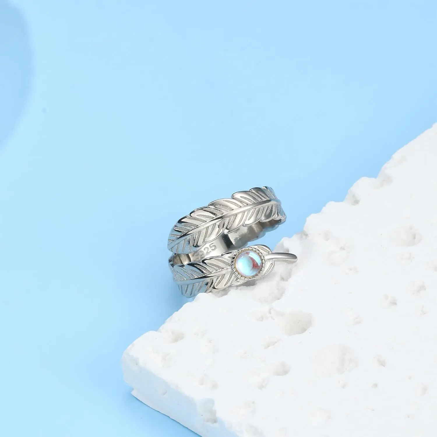 Sterling Silver Feather Ring: This open moonstone ring for thumb was crafted from 99% sterling silver with 18 k white gold plated, high polished surface allows it to better hold up against daily harmful substances, keep the sterling silver ring always shiny. Sterling silver material is comfortable to wear
