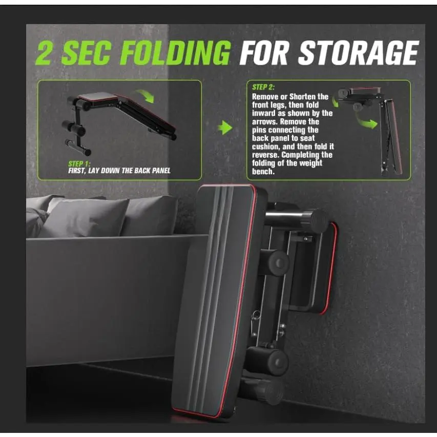 3-Sec Fold, Only Take Up 20% Place: Foldable Weight Bench is very easy to carry and almost fully pre-assembled,store the weight bench anywhere you like in any small space!Can be easily stashed away under the couch/bed, in the corner/cabinet or trunk.Easy storage, easy transport.