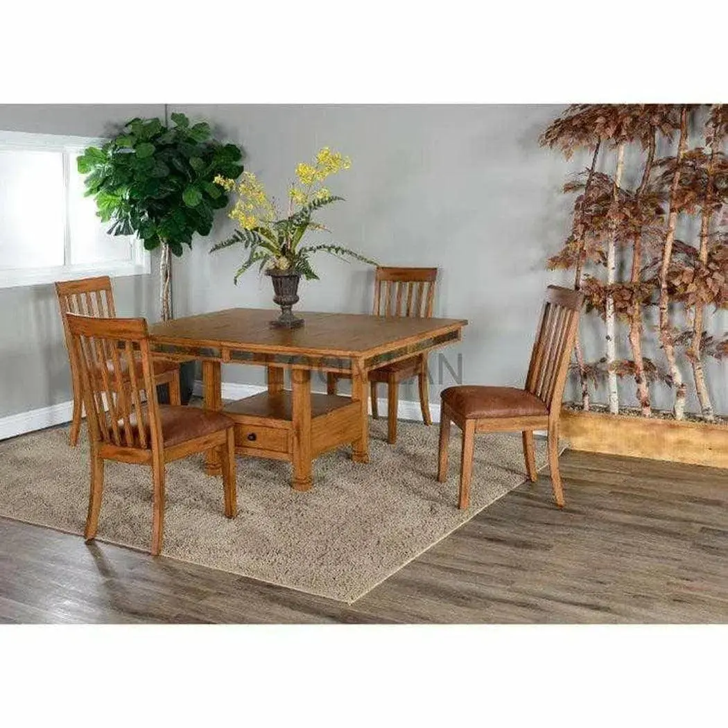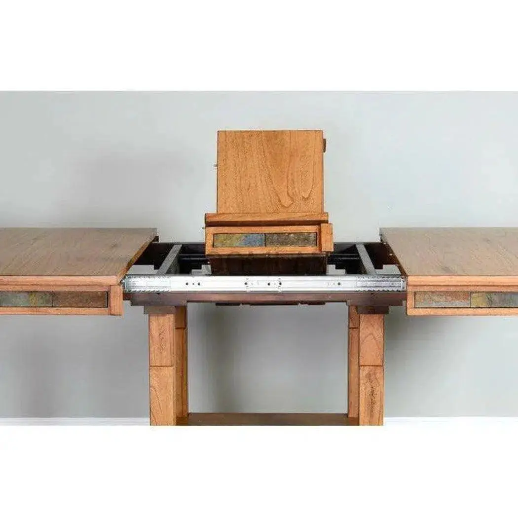 Impress your guests with our stunning 60-72" Adjustable Height and Extendable Wood Dining Table. Perfect for intimate dinners or large celebrations, this well-crafted table boasts an adjustable height and length, natural slate accents, and a convenient utility drawer. Made with sturdy Mindi wood in a rustic oak finish. Assembly required.