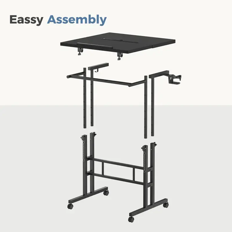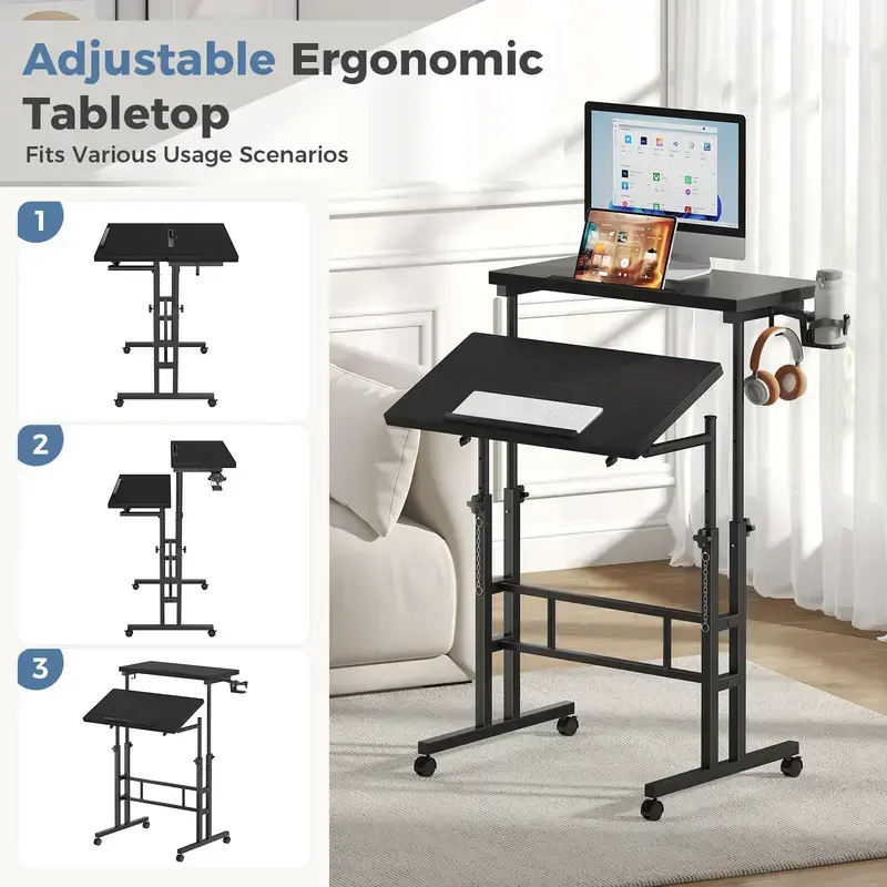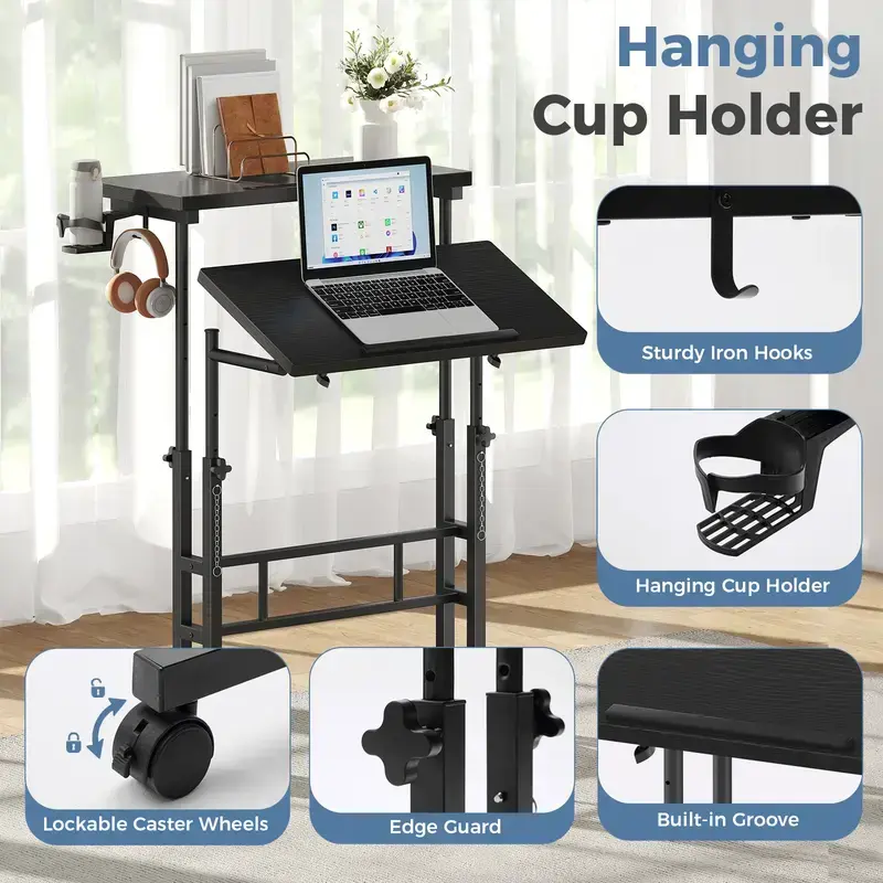 This rolling desk features a reinforced manual knob system that allows smooth height adjustment from 28" to 45". Easily switch between sitting and standing positions to create a more ergonomic and comfortable workspace without electricity.