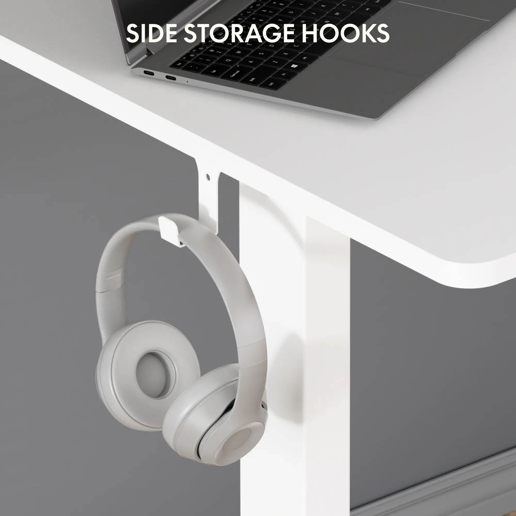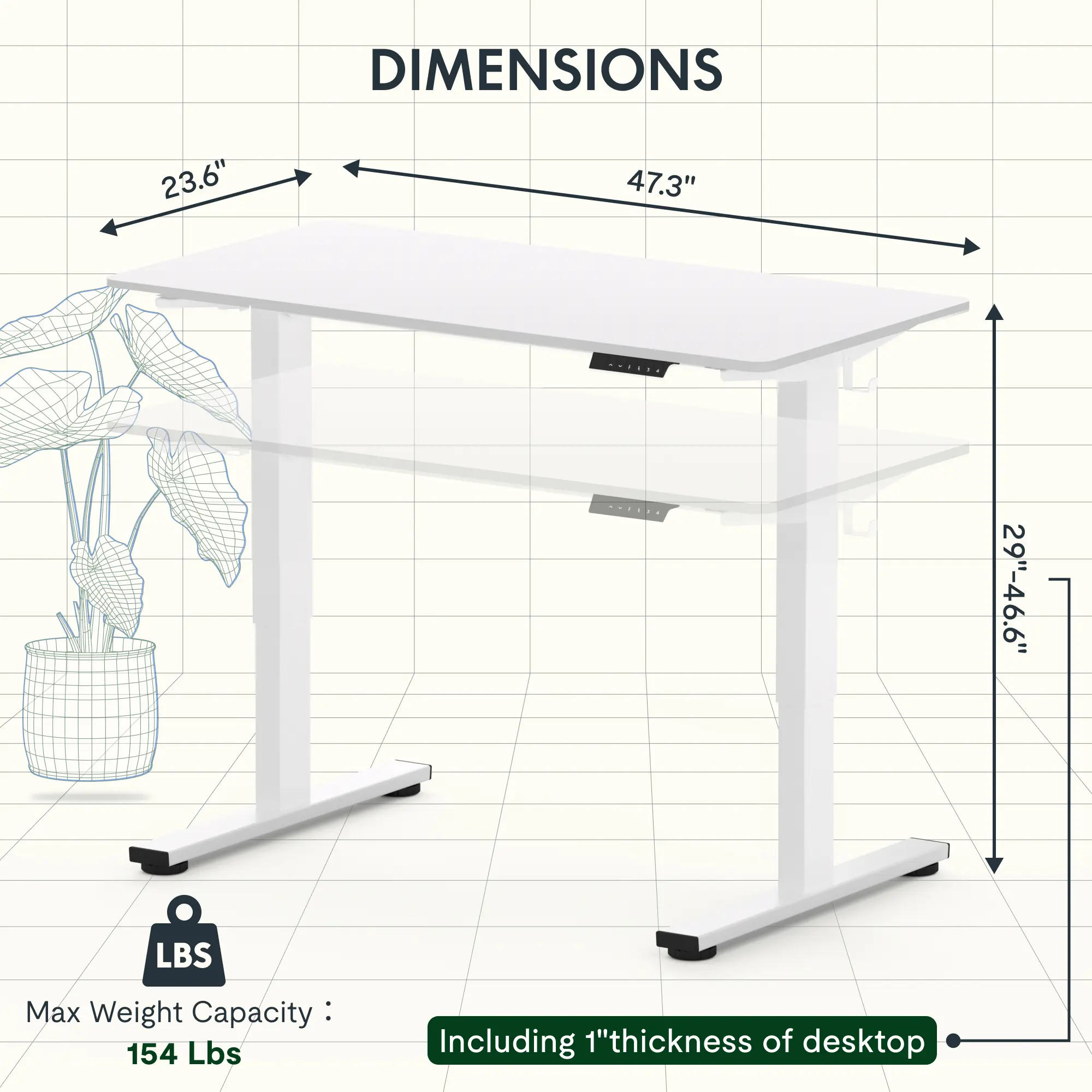 Our desk features a motor lift mechanism for seamless height adjustments, ranging from 28.1" to 45.7" (excluding 0.6” thickness of table top), with a smooth operation speed of 0.6"/second and low noise levels (under 50 dB).