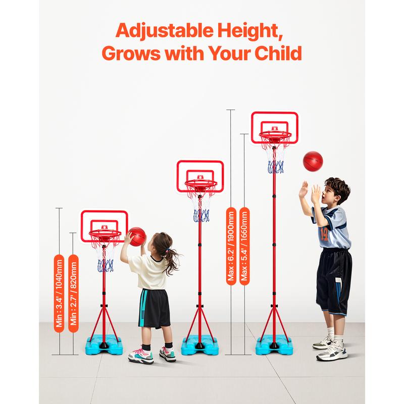 • Adjustable Height: The kids basketball hoop can be adjusted from 3.4' to 6.2', with the hoop height ranging from 2.7' to 5.4'. It's designed to grow with your child, meeting the needs of different stages of development. Adjusting the height is simple—just loosen the screws, adjust the steel rods to the desired height, and tighten the screws to lock it in place.