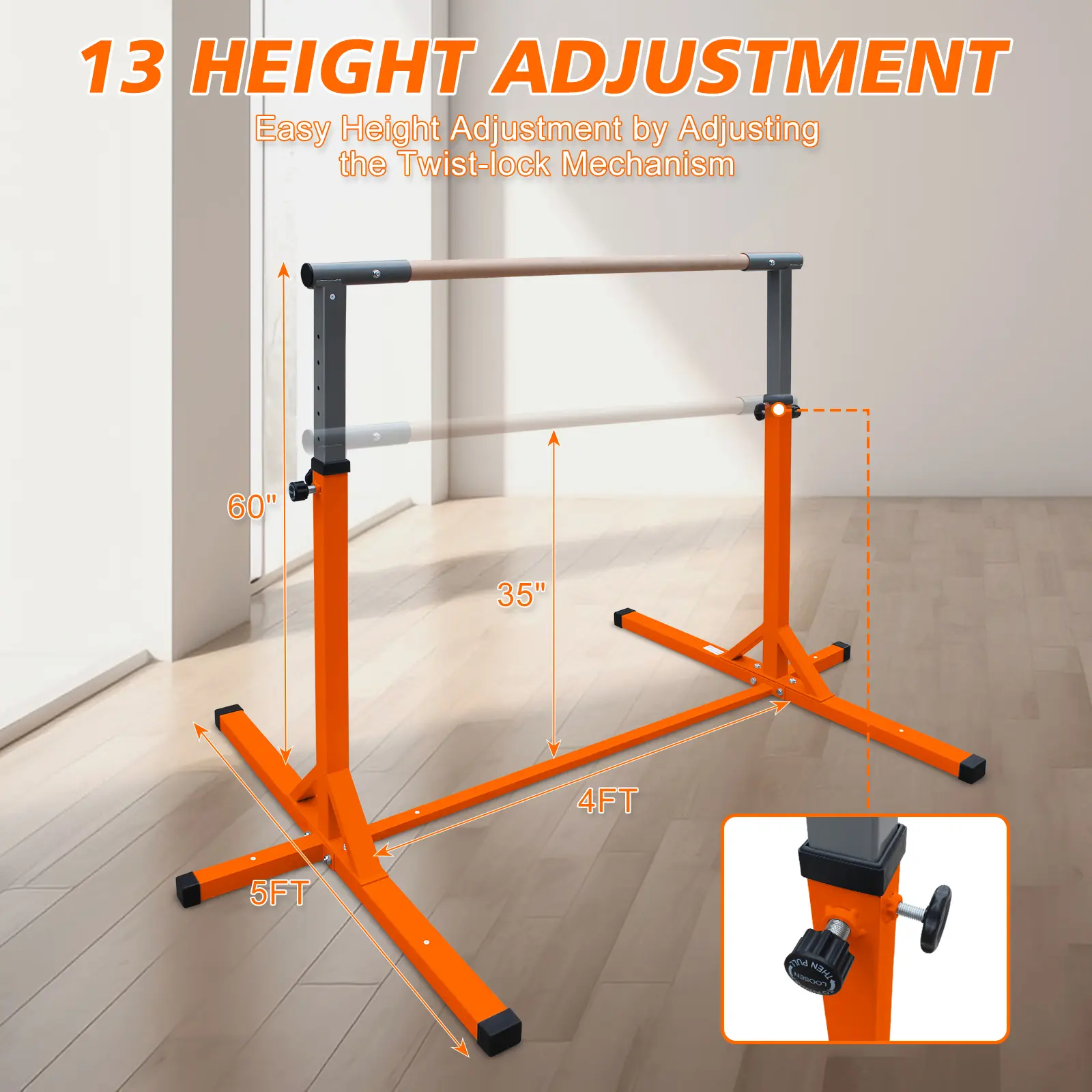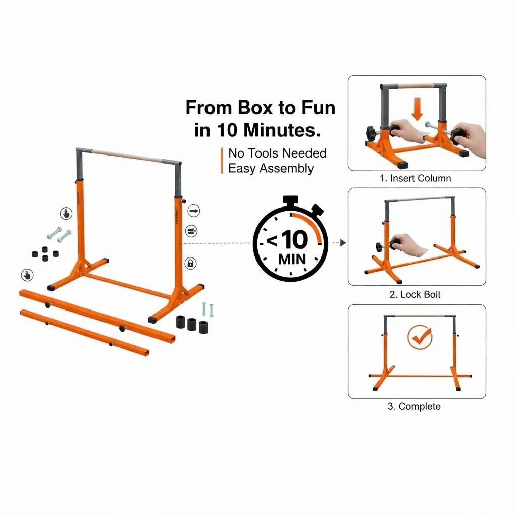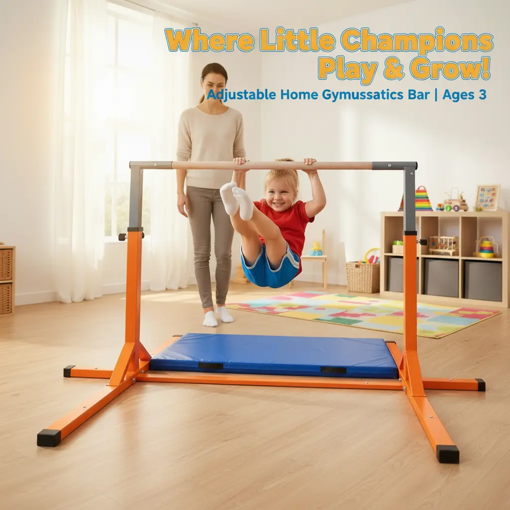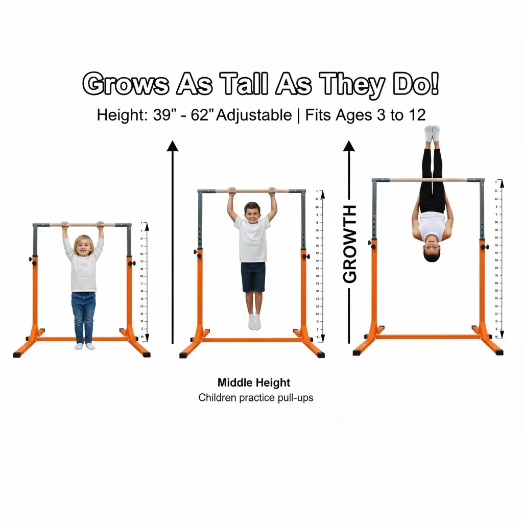 ·📏Grow-With-Me Adjustable Height:Customize the bar height from39 inches (3.25 ft) to 62 inches (5.2 ft)in minutes.Perfect for toddlers taking their first swing to pre-teens practicing advanced moves.