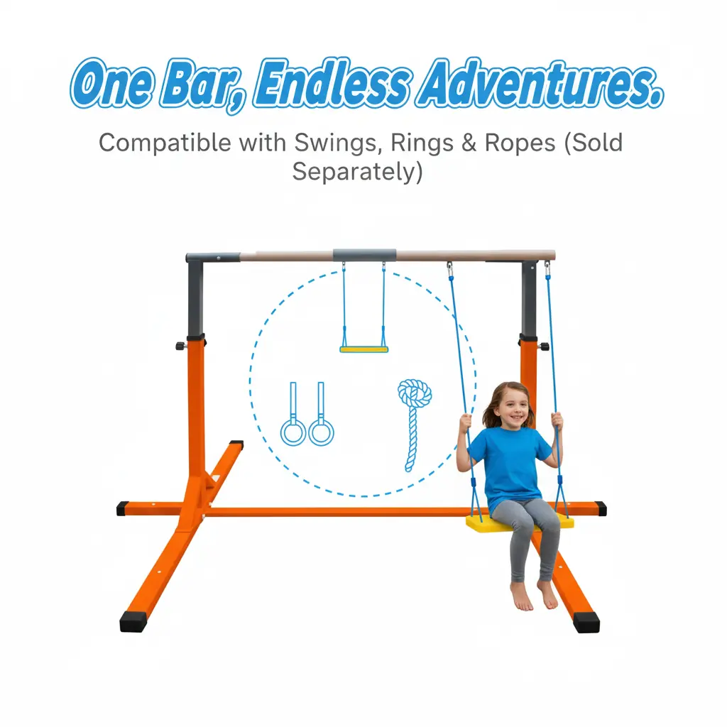 ·🎪Versatile Multi-Activity Center:Transform the bar into a full playset!Compatible with add-on accessories likeswing seats, gymnastics rings, and climbing ropes(sold separately) for limitless fun.