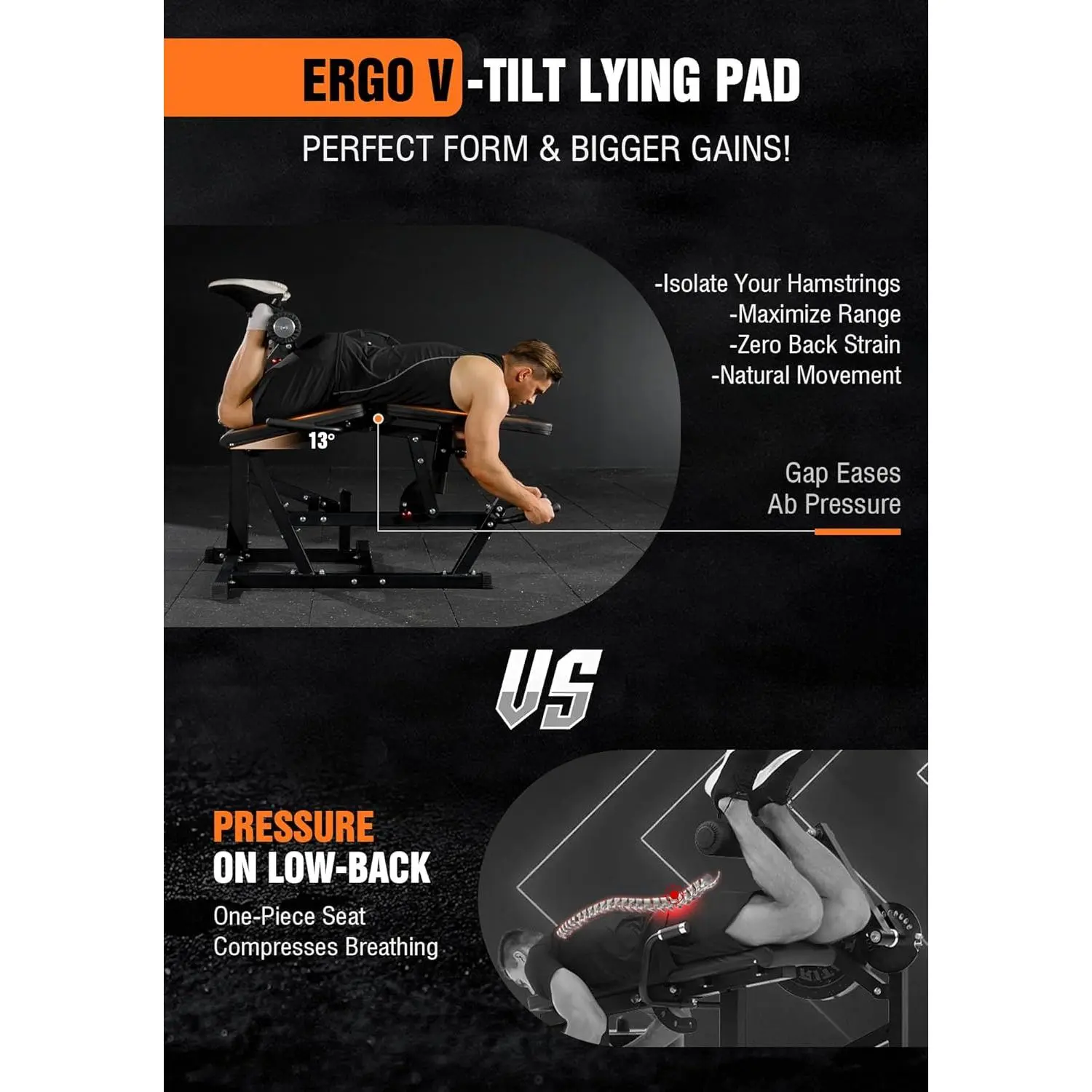 Pro Comfort & Performance: Engineered for leg curls, our 13° V-tilt design and ab-gap feature significantly reduce lumbar pressure, isolate hamstrings, and eliminate ab compression-unlike one-piece flat benches that cause back strain and restrict breathing.The extra-wide seat offers unmatched freedom of movement and comfort, supporting massive growth.Professional anti-sag ankle rollers ensure smooth, pain-free training.