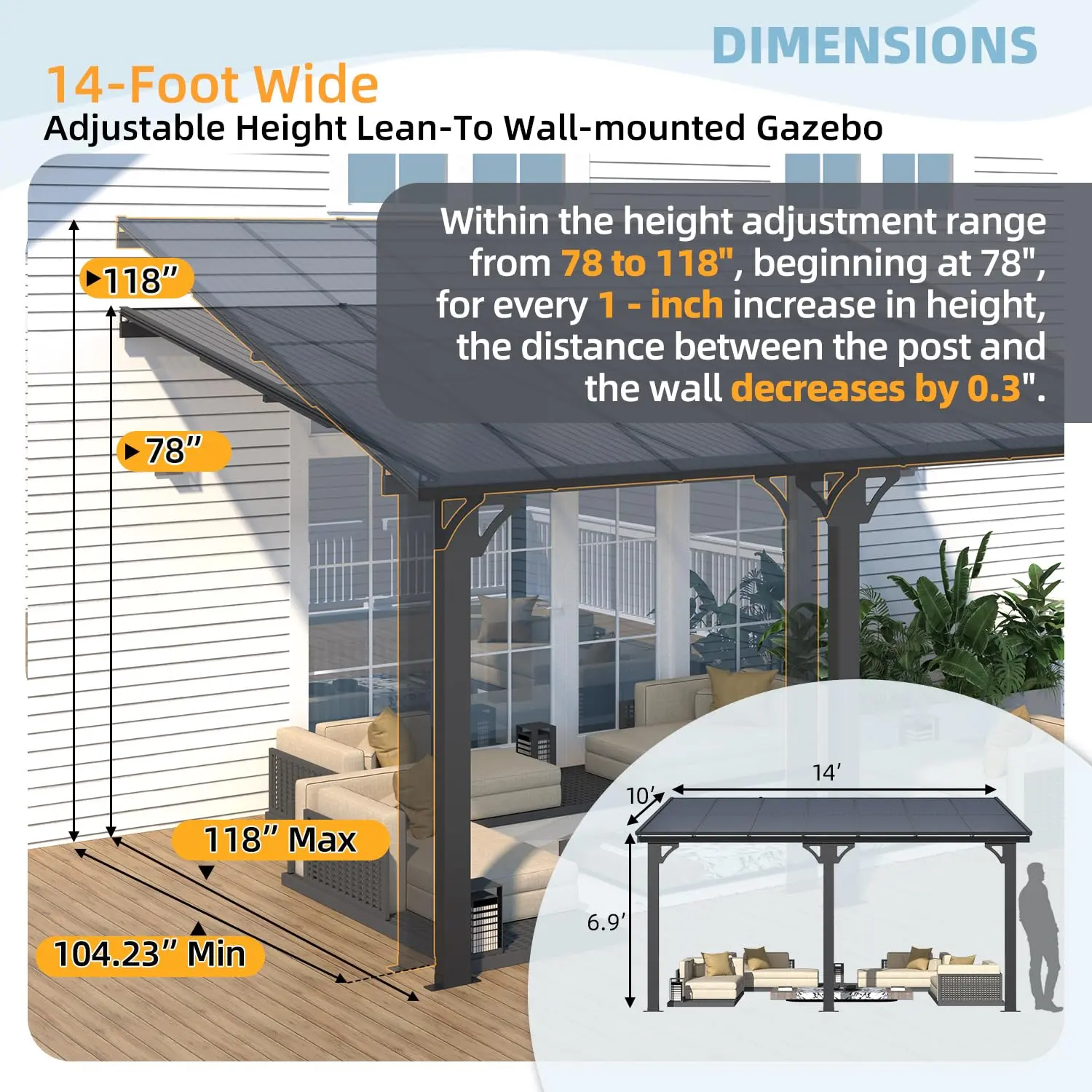 ·20" Adjustable Height Range: To accommodate different installation needs—whether matching eaves or adjusting for door frame height—our wall-mounted patio gazebo offers a flexible height range from 8.1 ft to 9.8 ft on the rear side (note: height adjustments affect front-to-back dimensions). This versatility eliminates installation headaches.