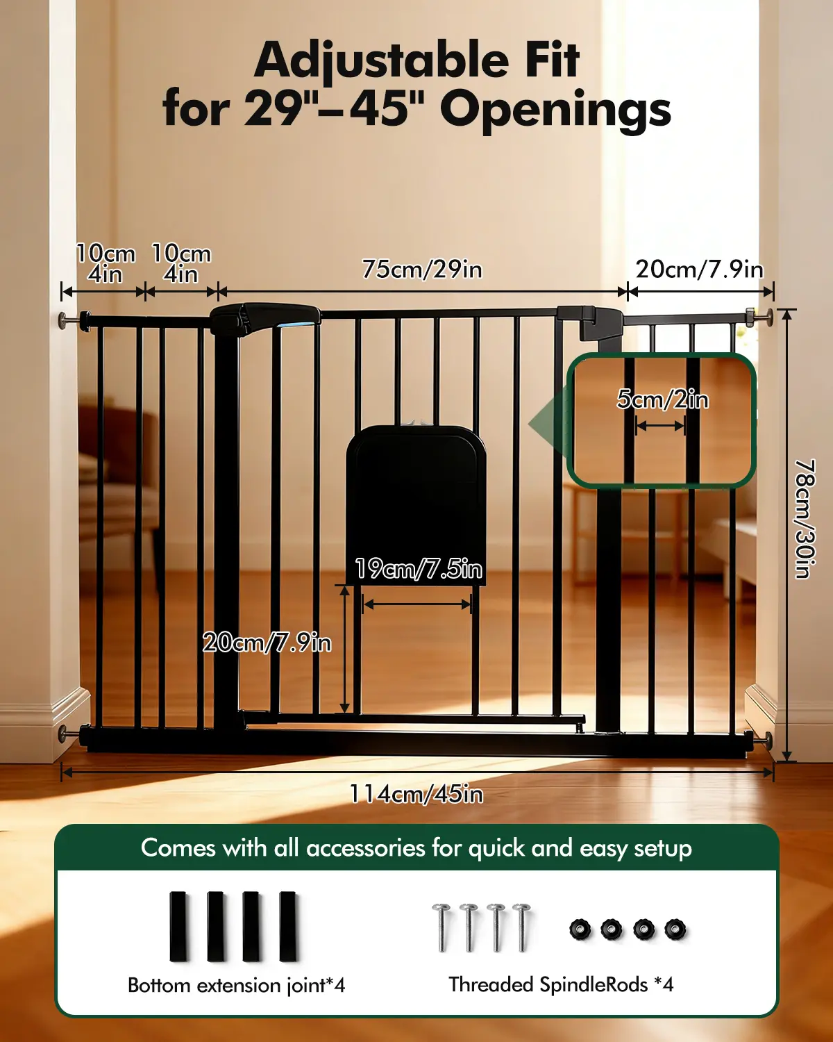 ·Perfect Fit for Your Home (29–45 Inches) Easily adjustable to fit doorways and stairs from 29–45 inches (75–115cm). Perfect for separating spaces in kitchens, living rooms, or at the top of stairs, offering flexibility and safety across your home.