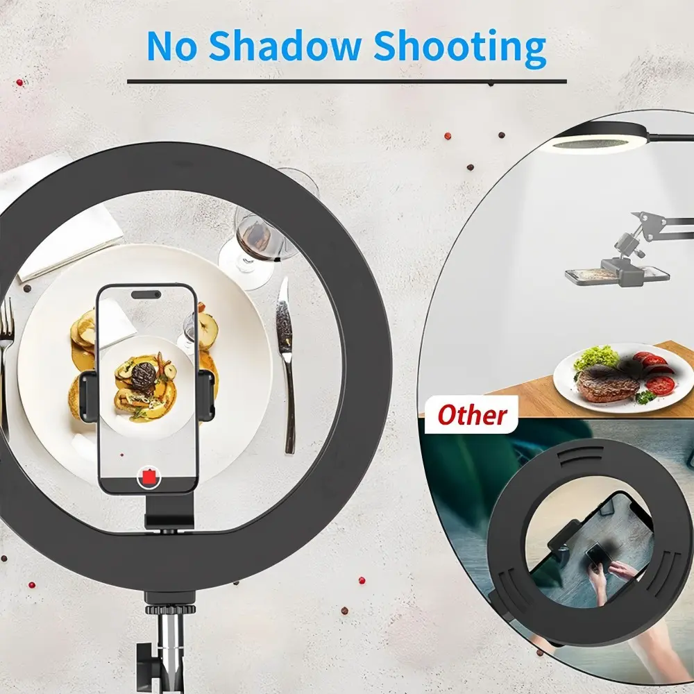 Pro Lighting Control: 3 color temperatures (5600K cool white, 4500K natural, 3200K warm yellow) paired with 10 brightness levels, offering 30 customizable lighting combinations. Its hollow-center design ensures shadow-free, uniform fill light, enhancing image clarity and color accuracy for live streaming, short videos, and still-life photography.