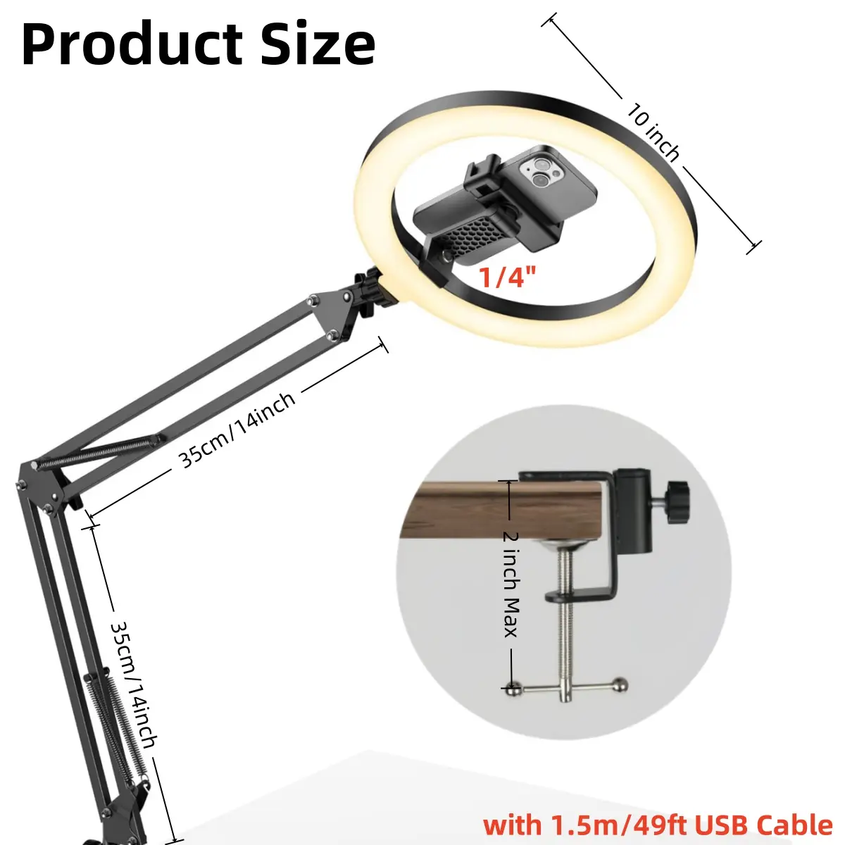 ·Compatibility: 1/4" standard thread for ring lights, webcams, mirrorless cameras, etc. Single interface—devices cannot be installed simultaneously.