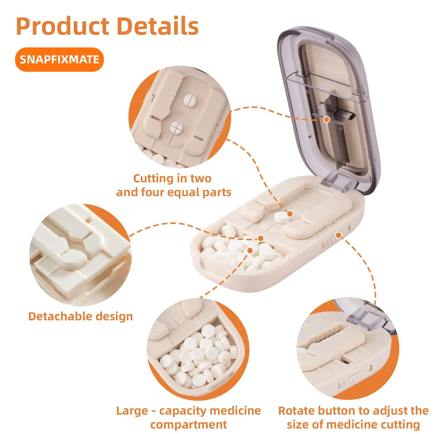 ·【Easy to Use】Just place the pills in the pill cutter, adjust 2 bars that ensure the pills stay in place. Then you press the top down evenly—push in the center. It can cut your tablet/vitamin/supplement into 1/2-1/3-1/4 easily