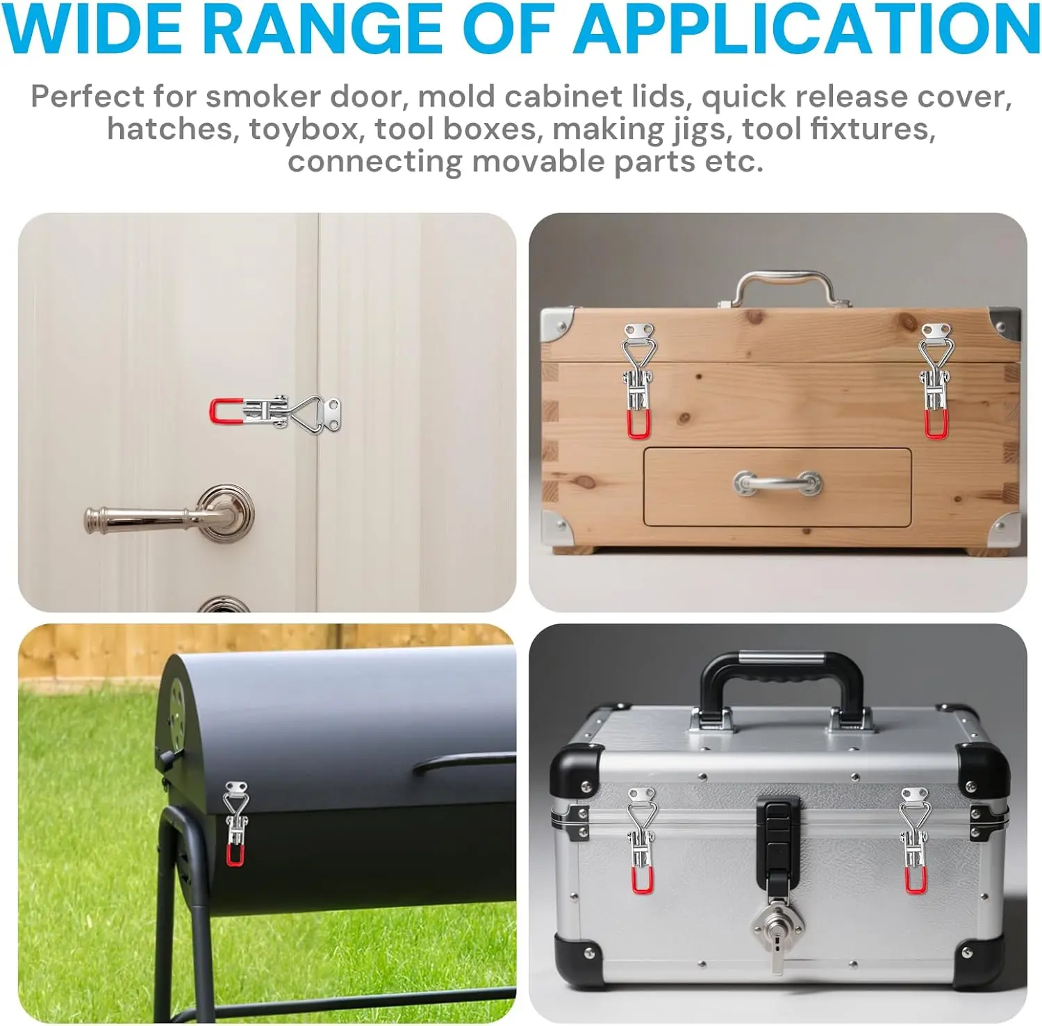 ·Wide Range Of Application: The adjustable toggle latch clamp is widely used in box sealing (such as refrigerators, tool boxes, storage boxes), industrial fixing (such as tooling fixtures, machine tool doors), furniture and home (such as cabinets, drawers), vehicle transportation (such as trailer tailgates) and outdoor DIY and other scenarios.