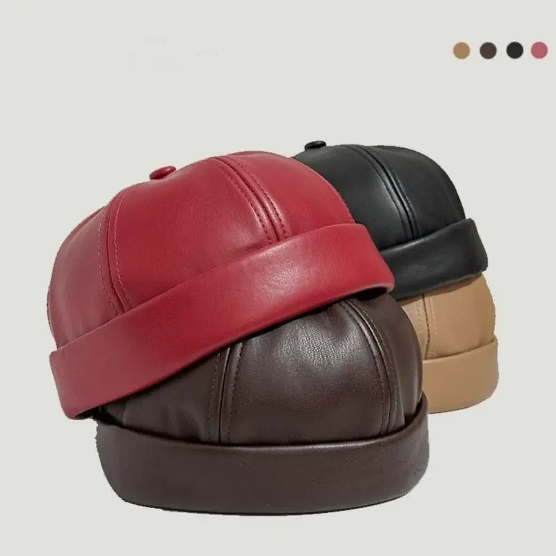 Adjustizable Retro Brimless PU Leather Docker Cap - Solid Color Brimless Hat Suitable for Non-Textile Adjustable Strap Casual & -Casual Wear Ideal for & Sensitive Light Beige