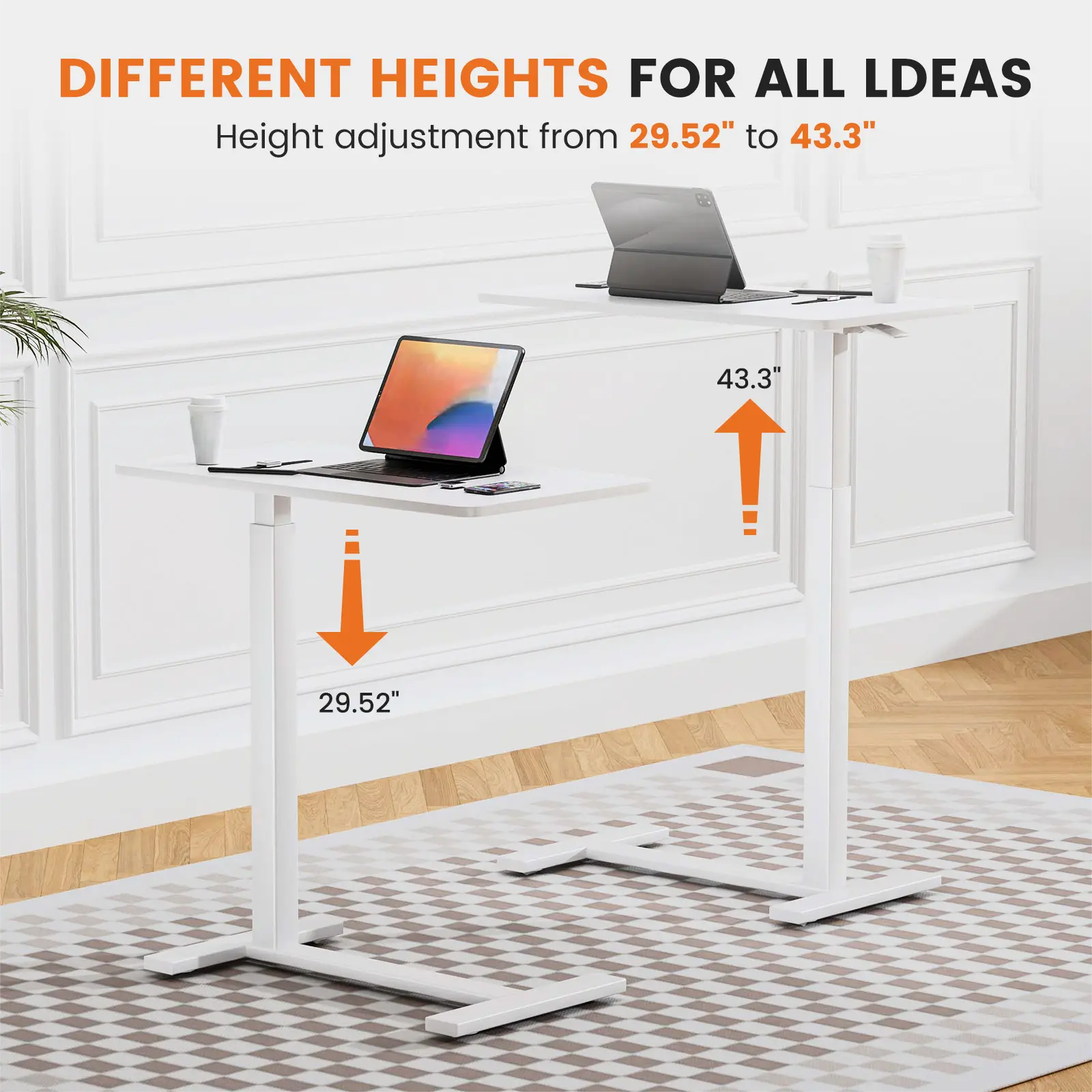 ·【Saving Space】Adopted a combination of single-column structure design and simple base design, which help save space while giving your legs plenty of room to stretch when you sit down. Wheels with brakes allow you to stop wherever you want. You can slide this standing desk with wheels under your sofa or bed easily. It will reduce the occupied floor space while ensuring ample working space.
