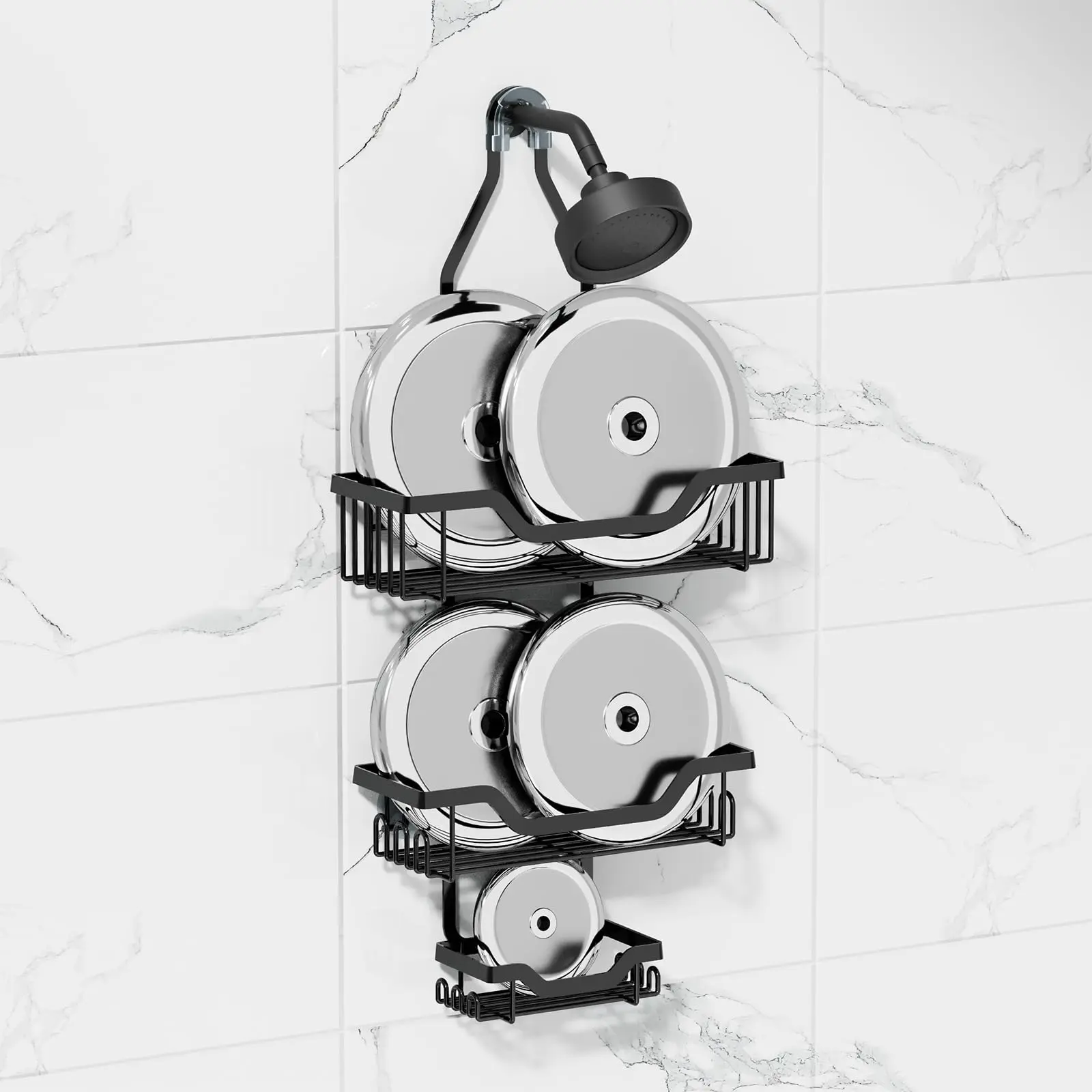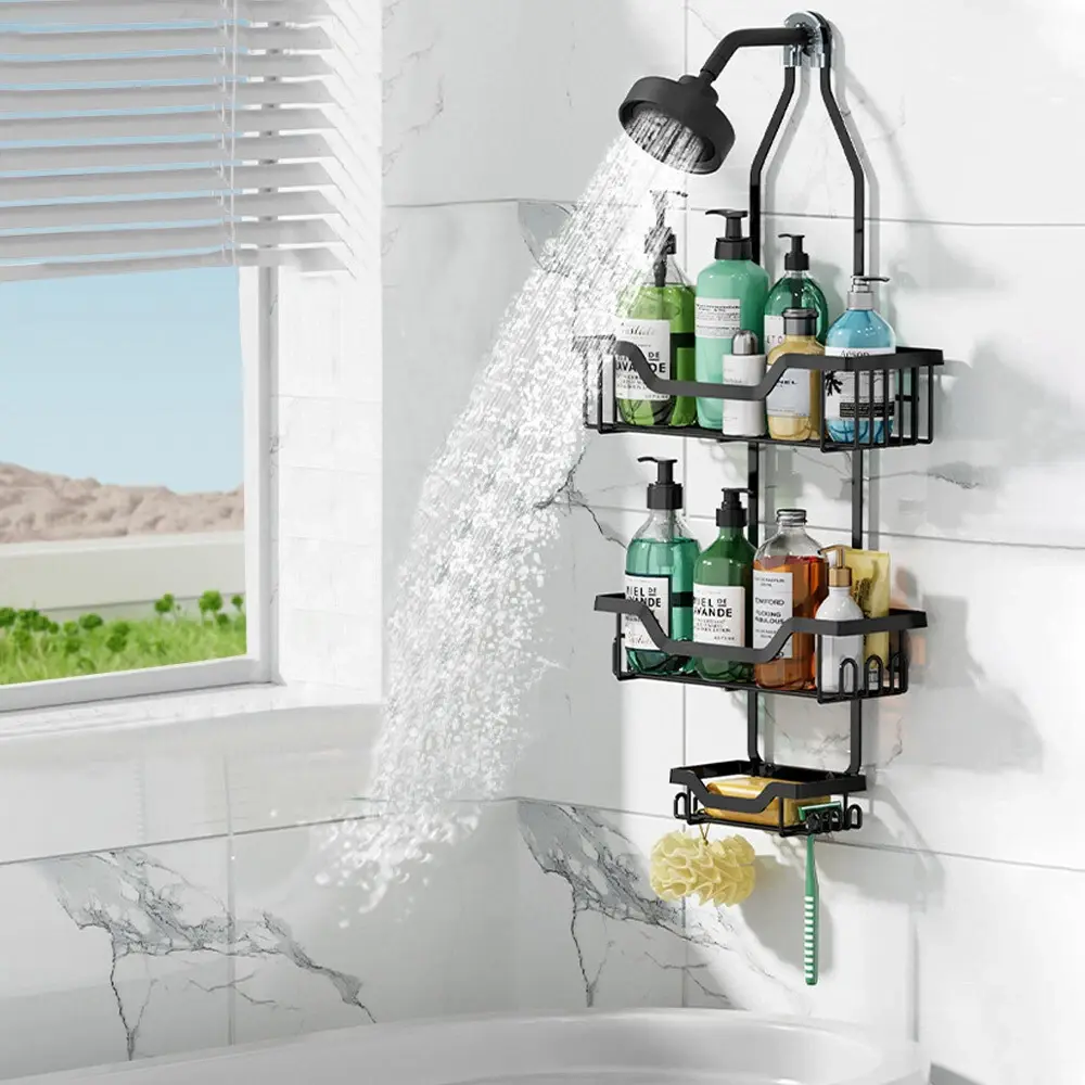 · Premium Material: The shower caddy over the shower Head is Made of Featured Iron and Hight-quality BLACK PAINT. It's Easy to Clean and Fairly Sturdy with Shelves that are at Good Heights This Design is Equipped with a Silicone Protective Cover to Prevent the Shelf from Sliding