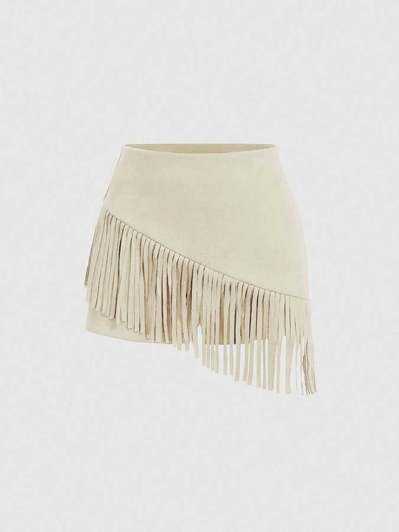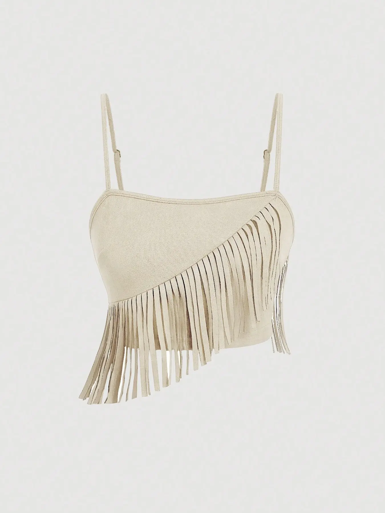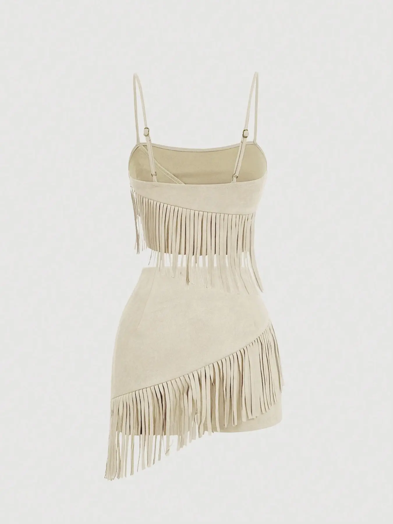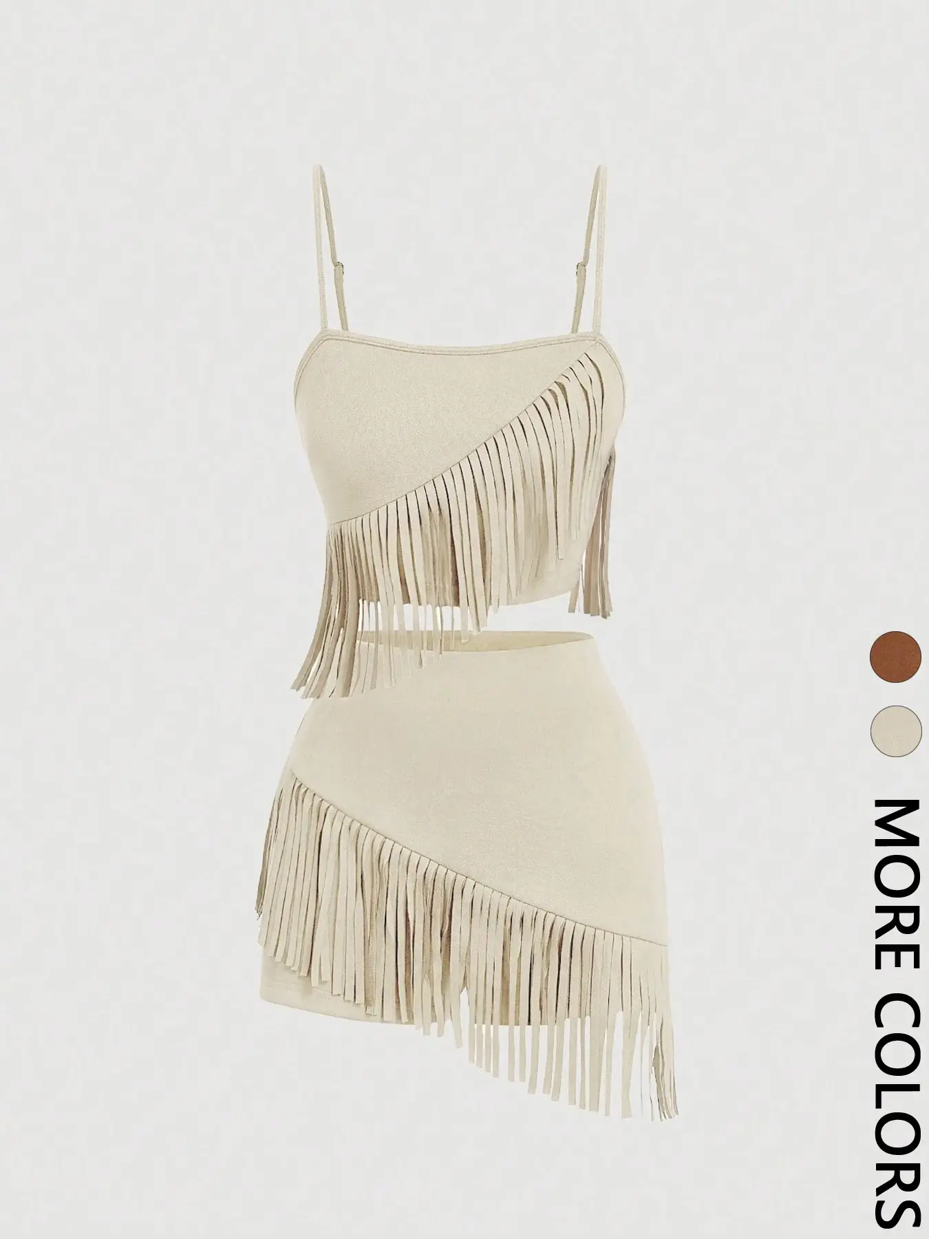 Adjustable Strap Fringe Outfit - Western Baddie Spaghetti Strap Cami & Skirt Matching Set