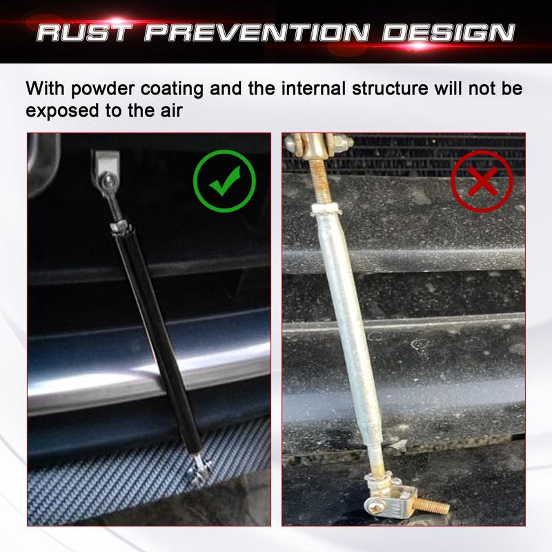 • These adjustable strut rods offer a versatile solution for car customization. They are specifically crafted to support the front bumper lip, ensuring stability and style. The adjustable length (8"-11") allows for a perfect fit on various vehicles.