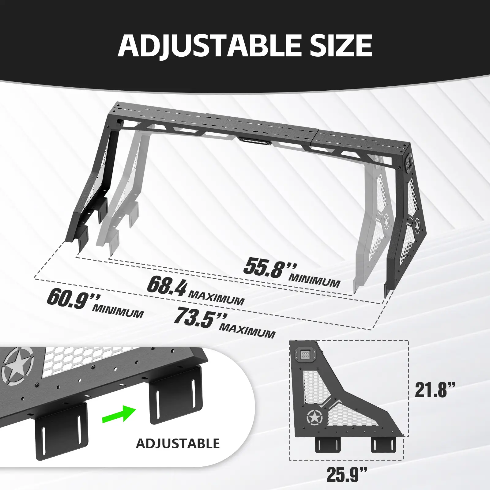 The roll bar features an adjustable width range of 55.8” to 68.4”, with a fixed height of 21.8”. This allows for a perfect fit across different truck bed sizes. Ensure a precise fit for your specific truck model.