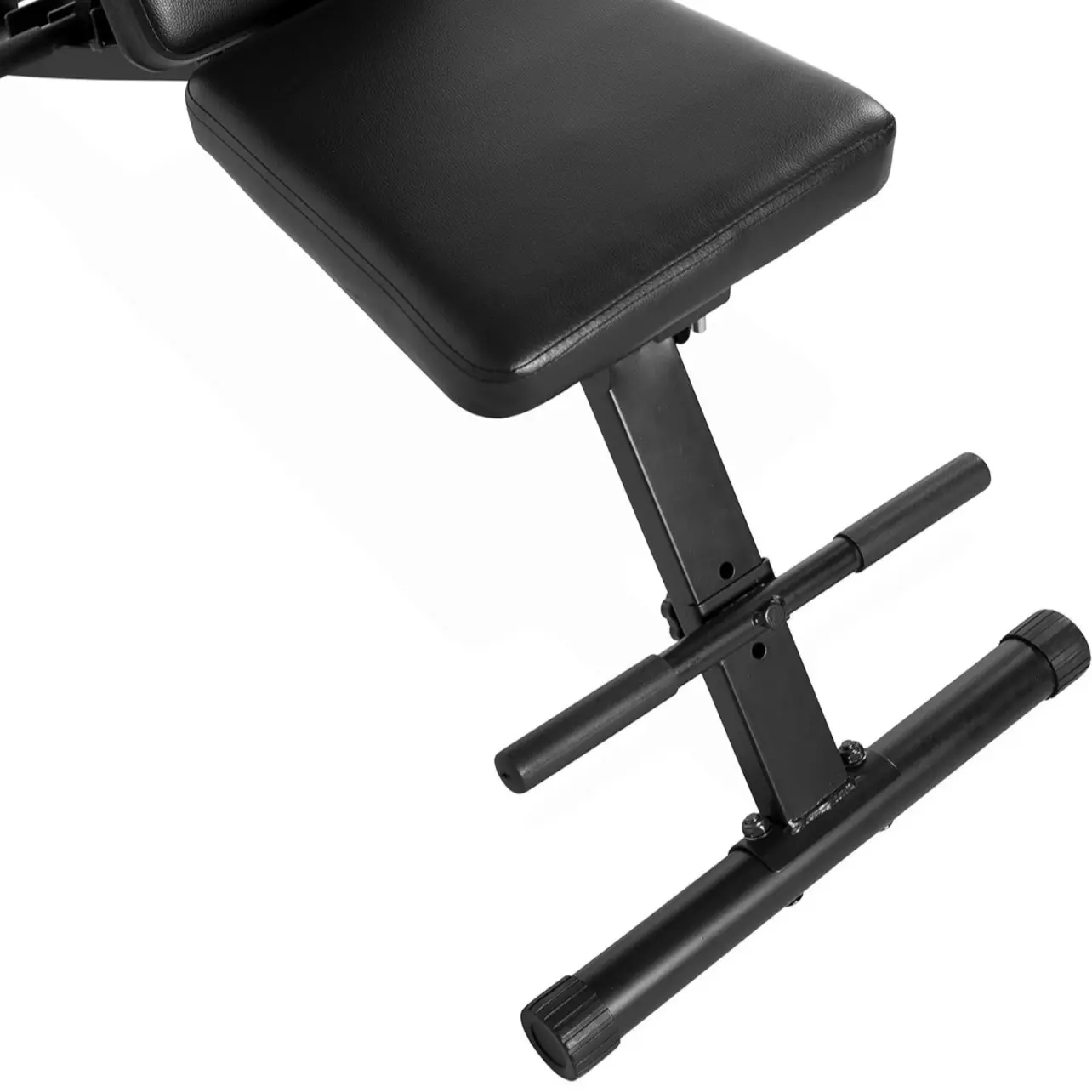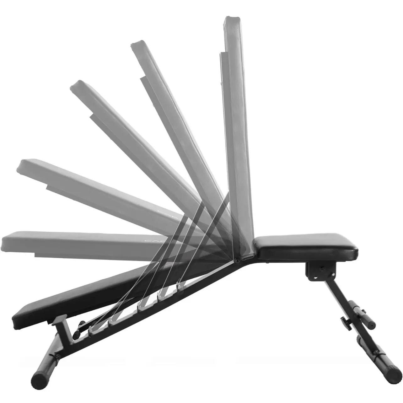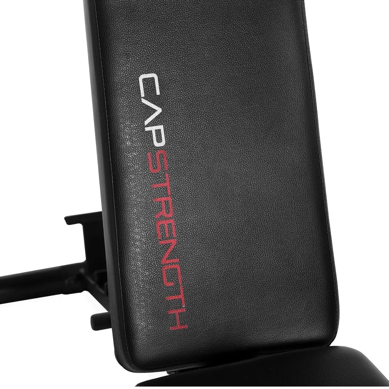 The CAP Strength Multi Purpose Utility Bench in Black offers the flexibility and reliability needed when going heavy. The multi-position backrest offers 6 different positions, ranging from an upright position to a declined position. Designed with easy storage in mind, this bench can easily be folded and stored out of the way after use. This adjustable flat, incline, and decline bench can enhance your workout routine by allowing a variety of workouts to be performed at different angles. Target major muscle groups and get a full body workout with this FID bench. The double stitched boxed pad is firm yet comfortable and utilizes new foam material and CARB compliant plywood to provide less stress on your joints When going heavy. The cold rolled steel tubing and powder coated finish ensure a strong, durable weight bench that will last for years to come. The cross tube offers stability for your legs while in a declined position for abdominal exercises.