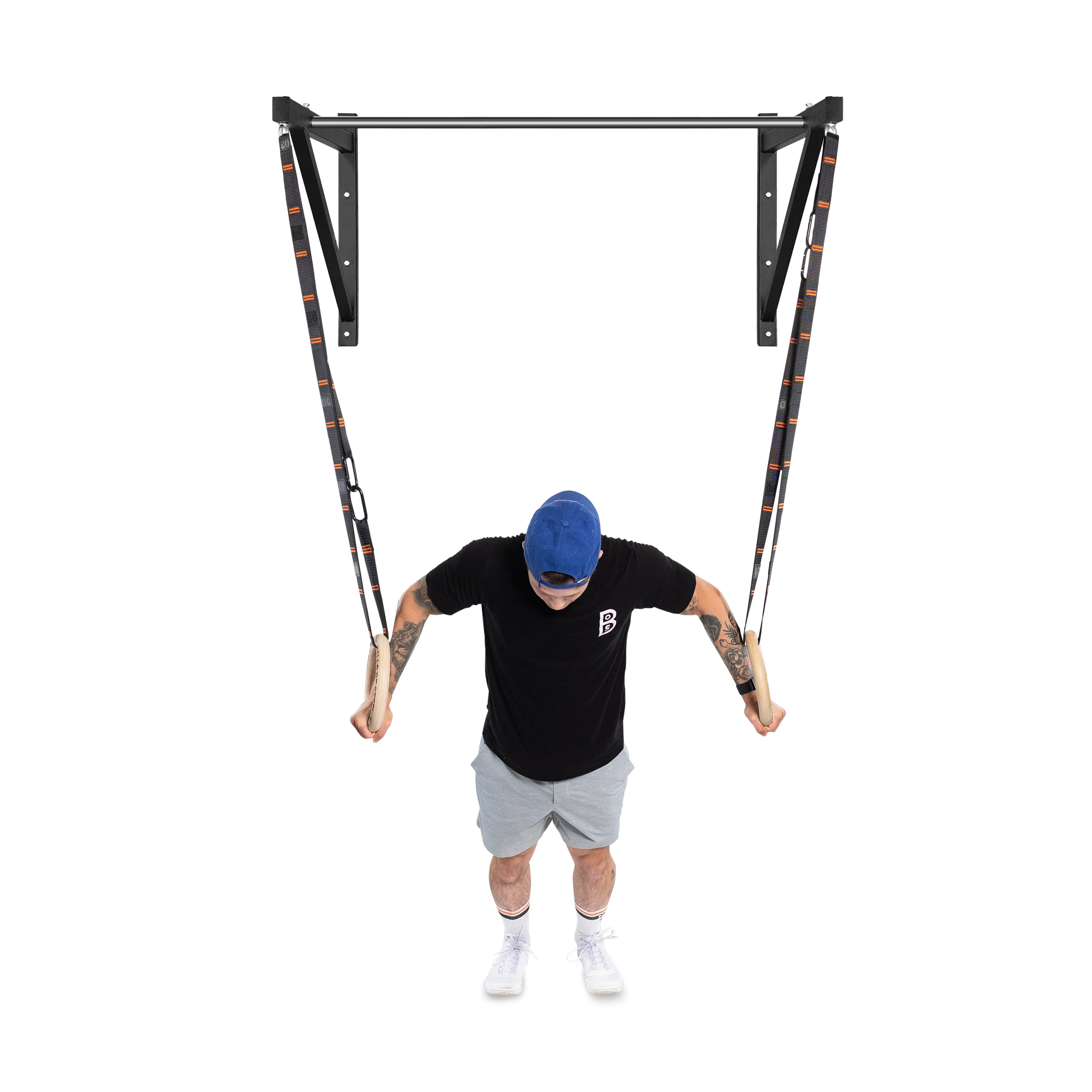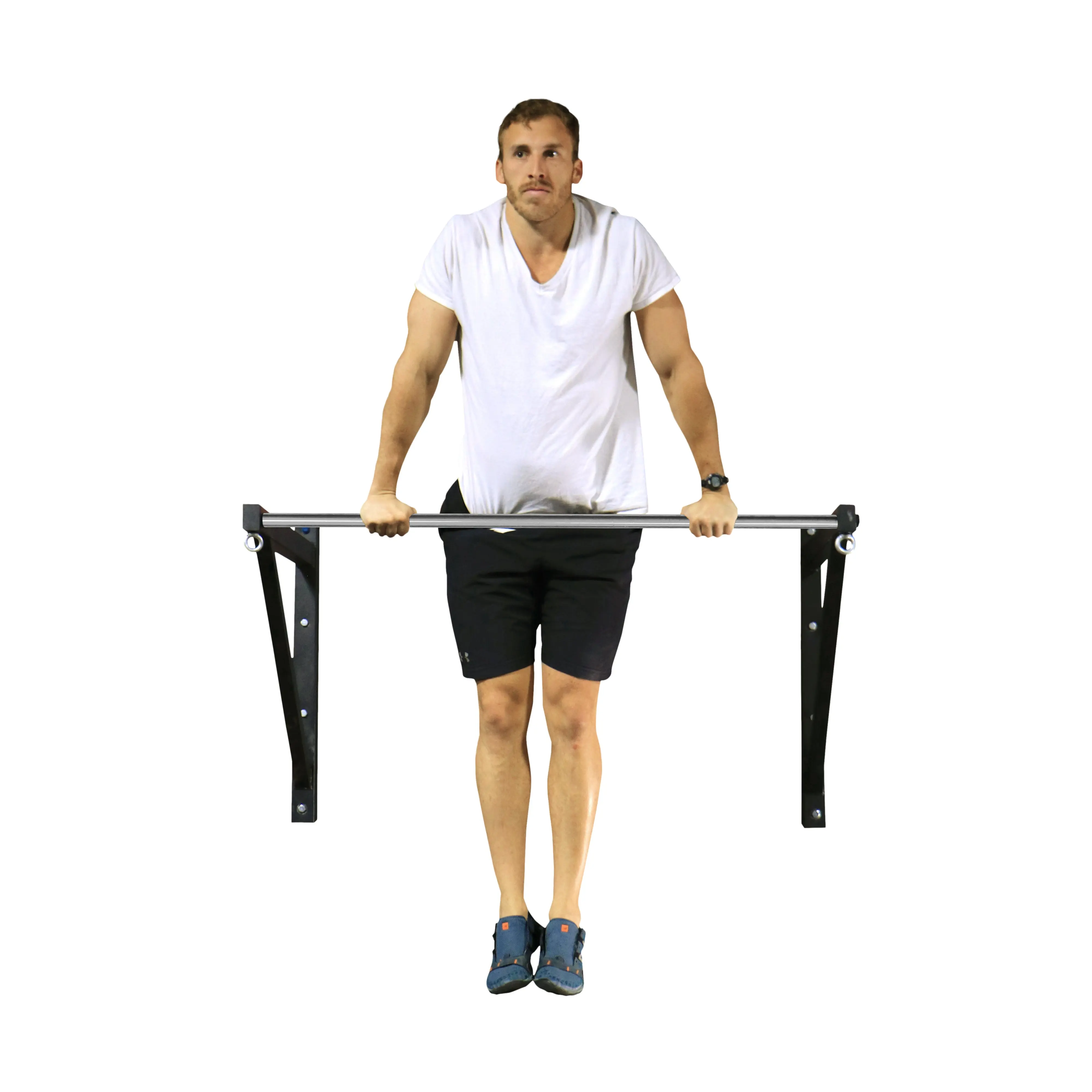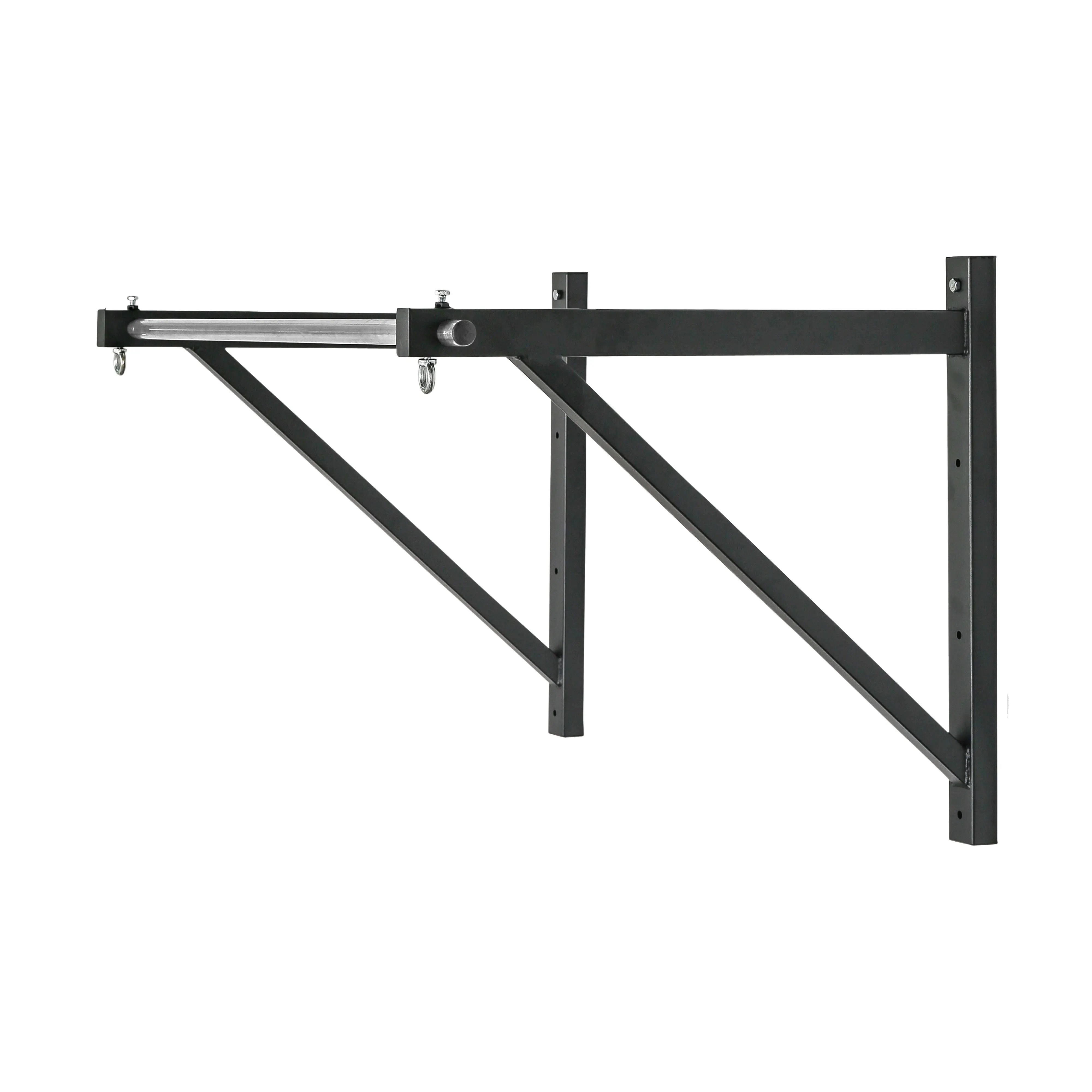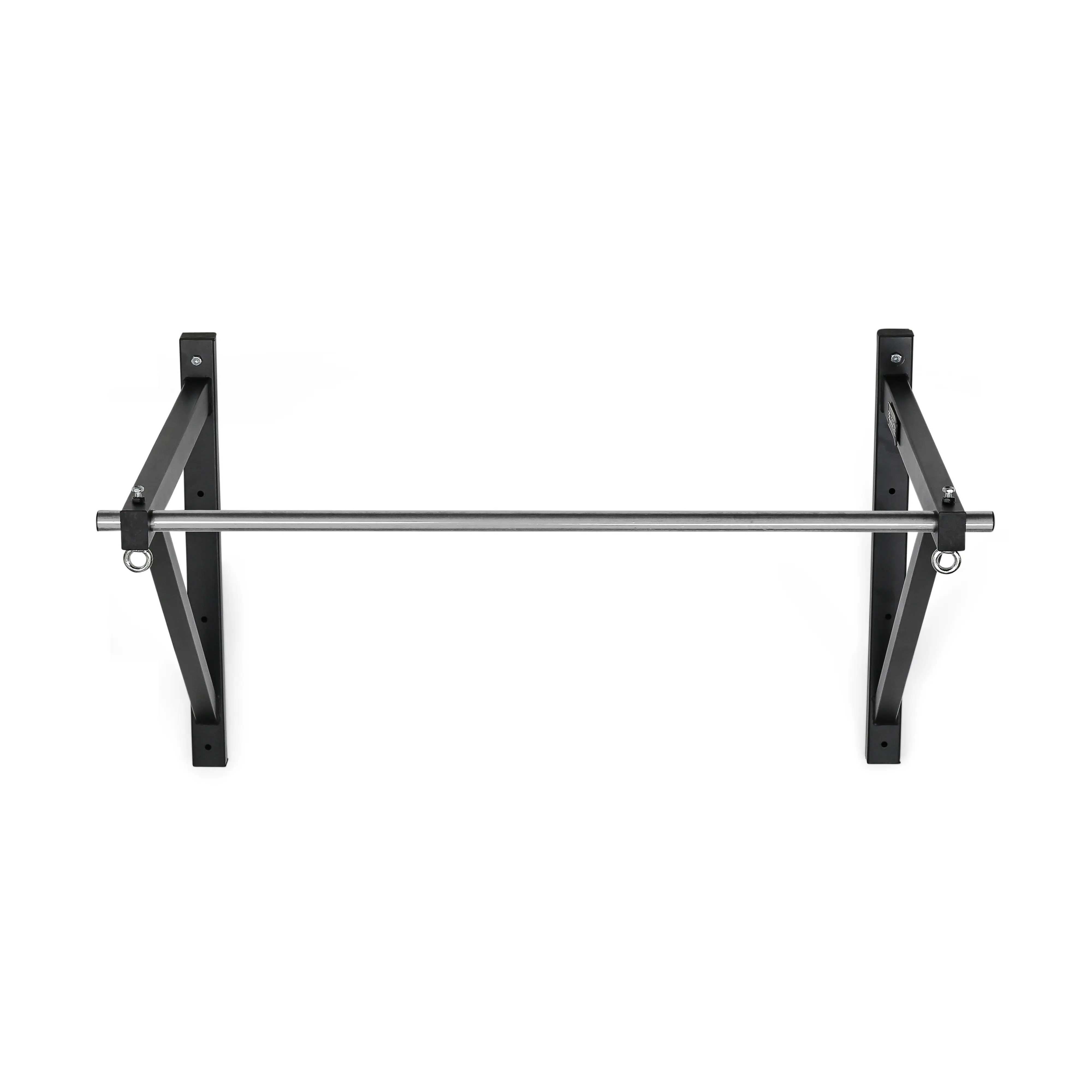 This bare steel pull up bar can be mounted on the ceiling for a vertical drop or directly to your wall with the included mounting hardware. This multipurpose marvel includes two convenient eyelets for mounting our pulley attachment (cable machine exercises, anyone?) or suspension spotter straps (hello ring rows!). The kipping-friendly design leaves plenty of clearance for spirited workouts.